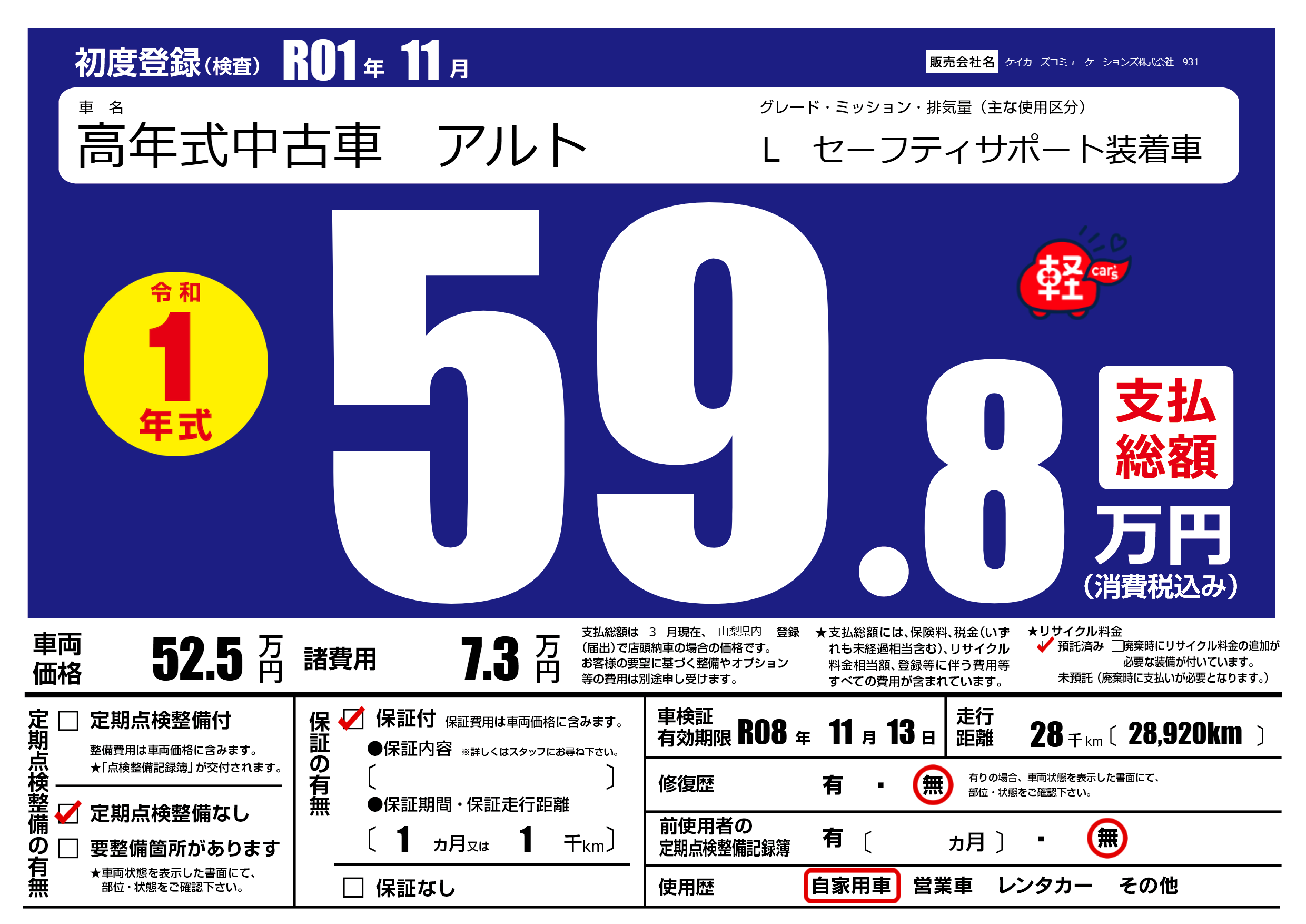 | 車名 | 高年式中古車 アルト | グレード ミッション 排気量 |