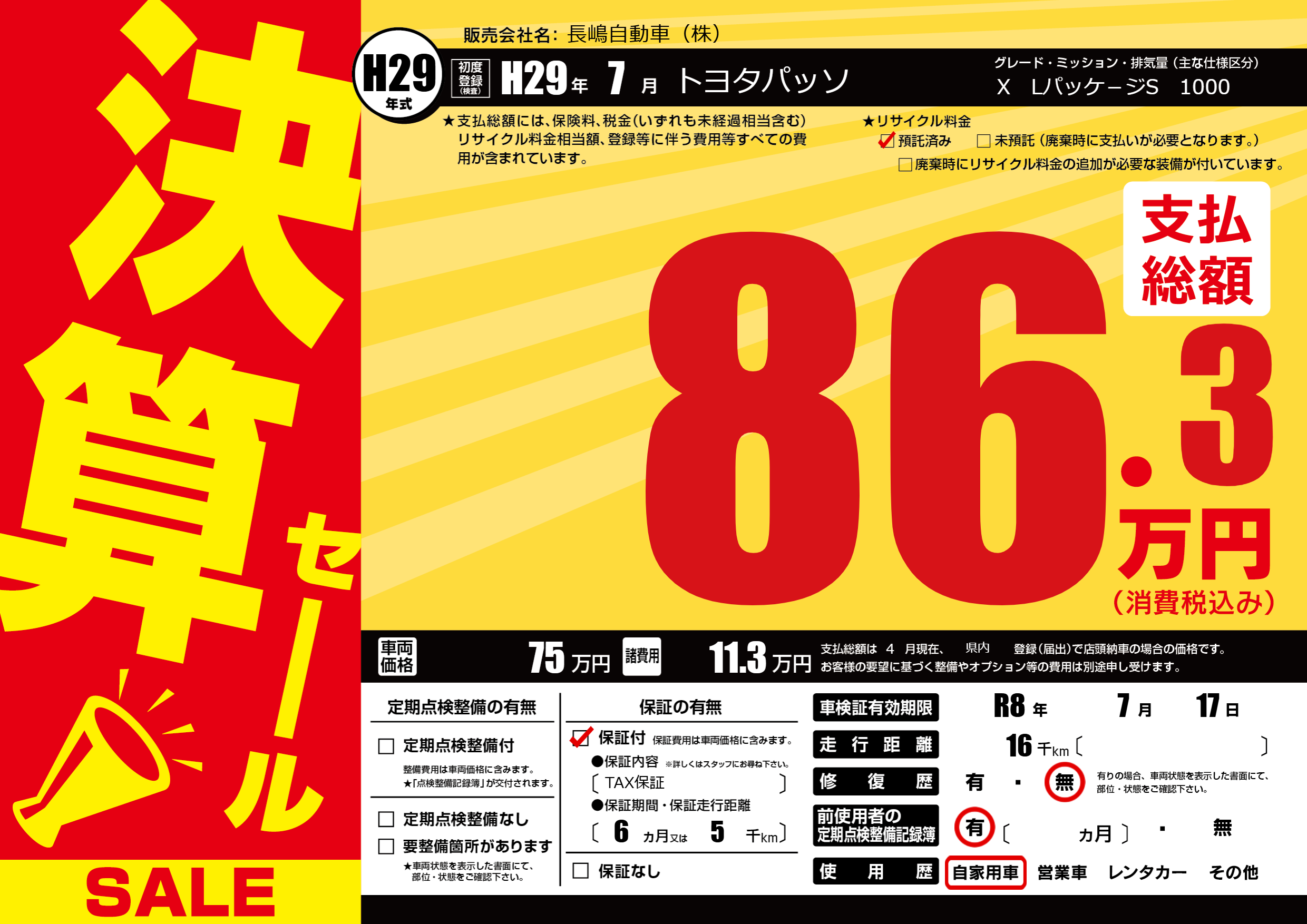 | 車名 | トヨタパッソ | グレード ミッション 排気量 |