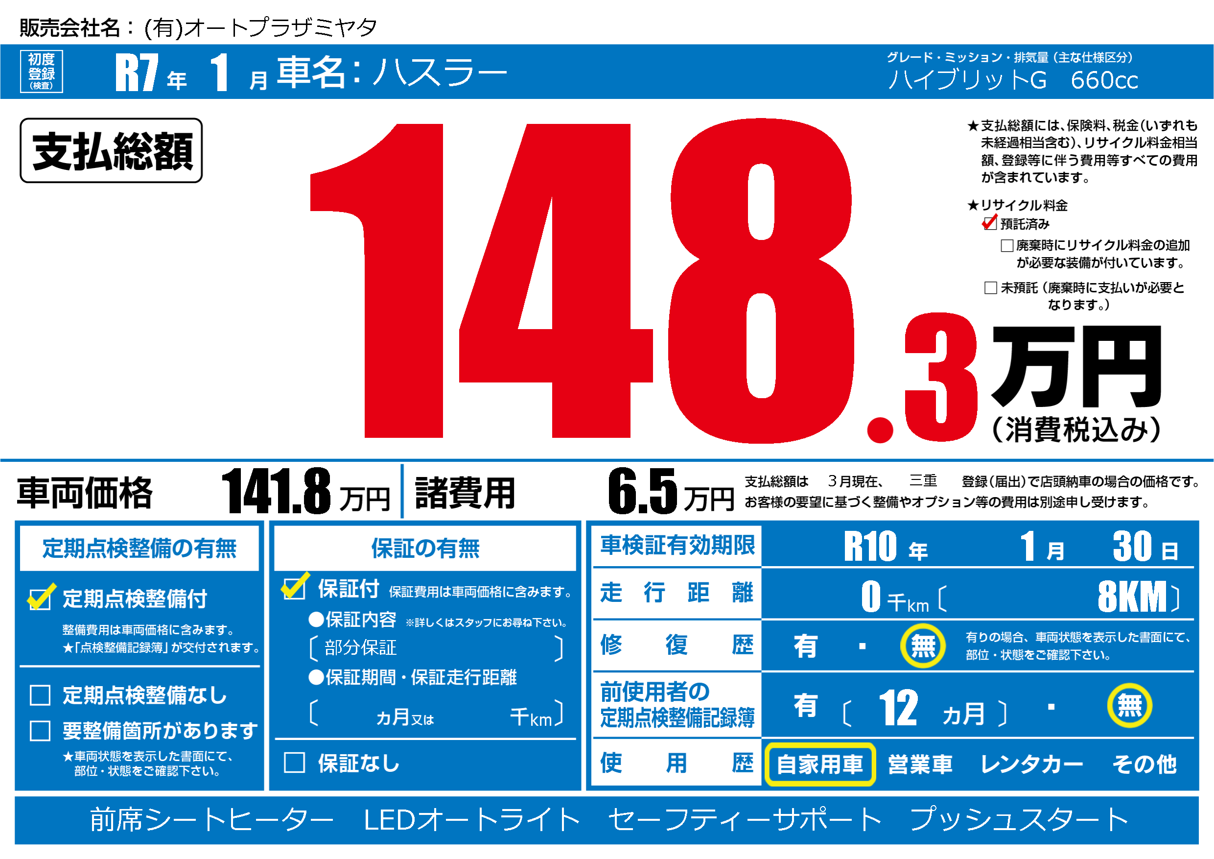 | 車検制限 | R10年 1月 30日 | ||