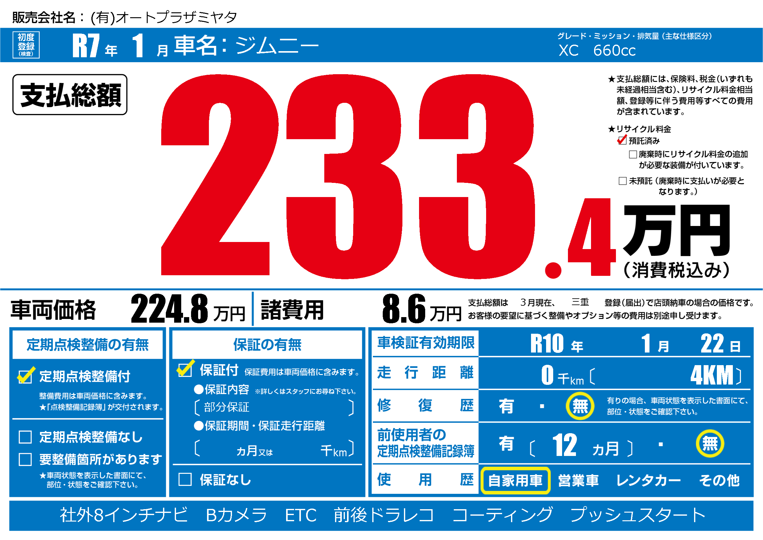 | 車名 | ジムニー | グレード ミッション 排気量 |