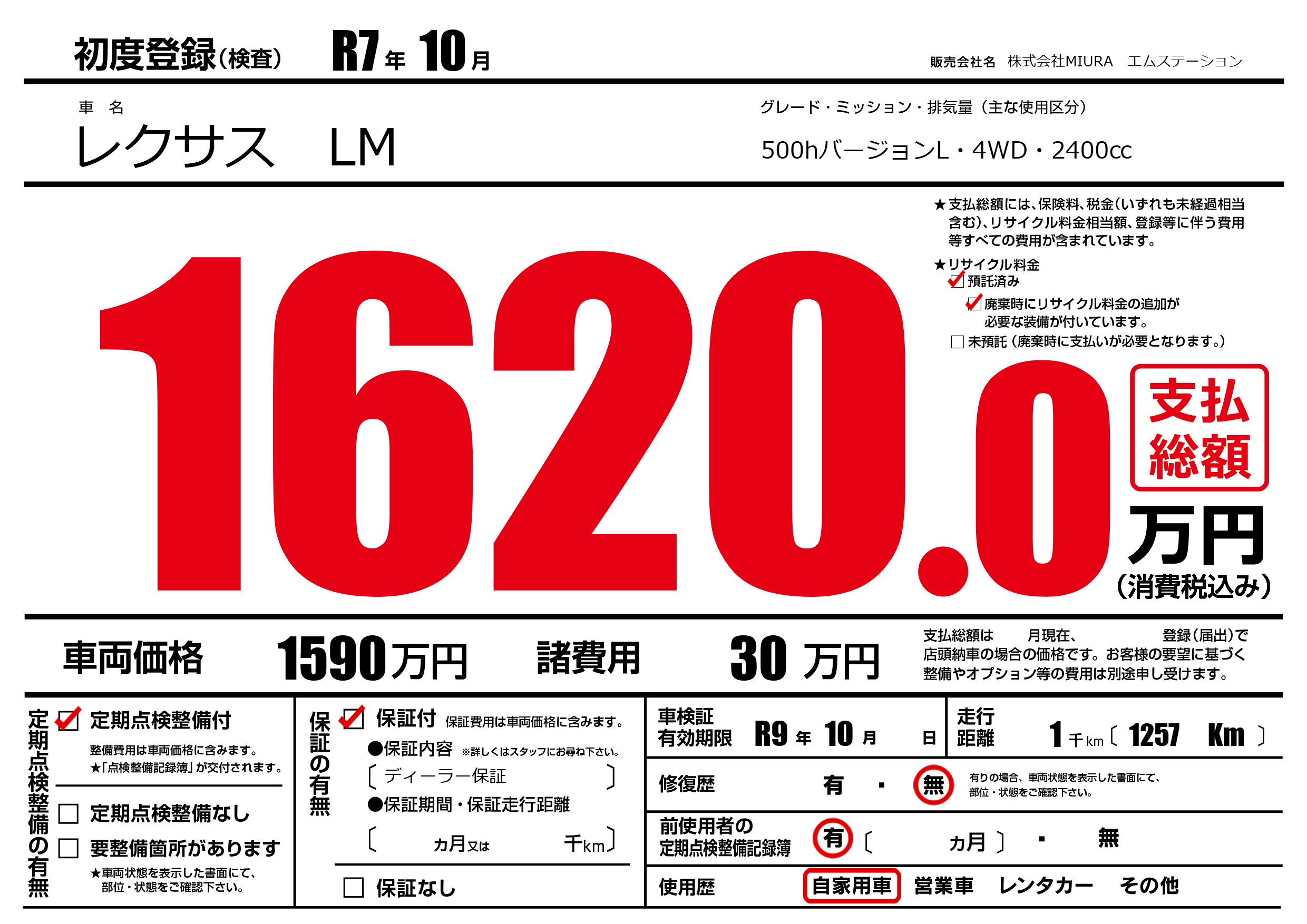 | 走行キロ | 0.1万km | 初年度登録 | R7年10月 |