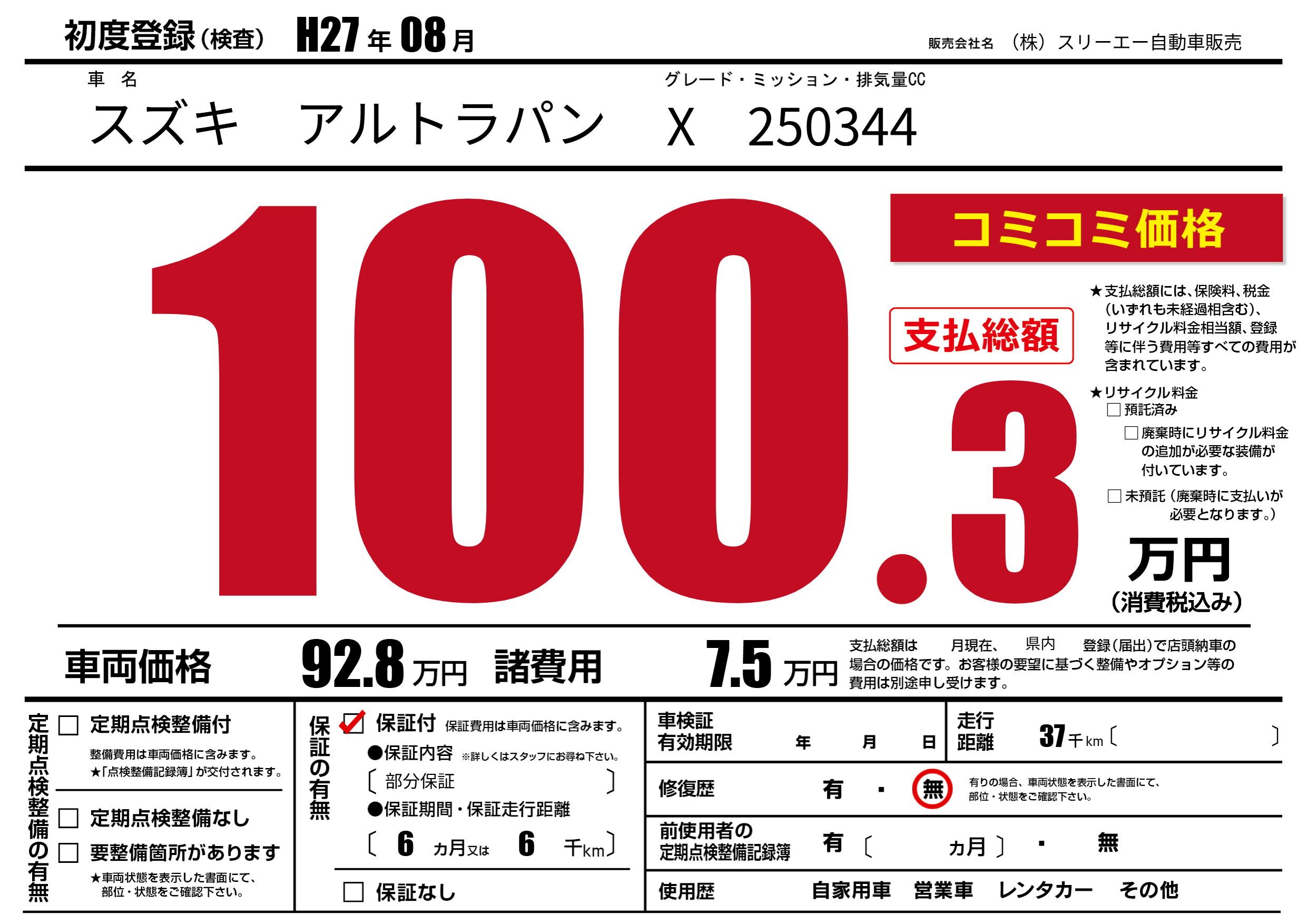 保証付き 保証内容(部分保証) 6ヶ月または(6)千kmまで |