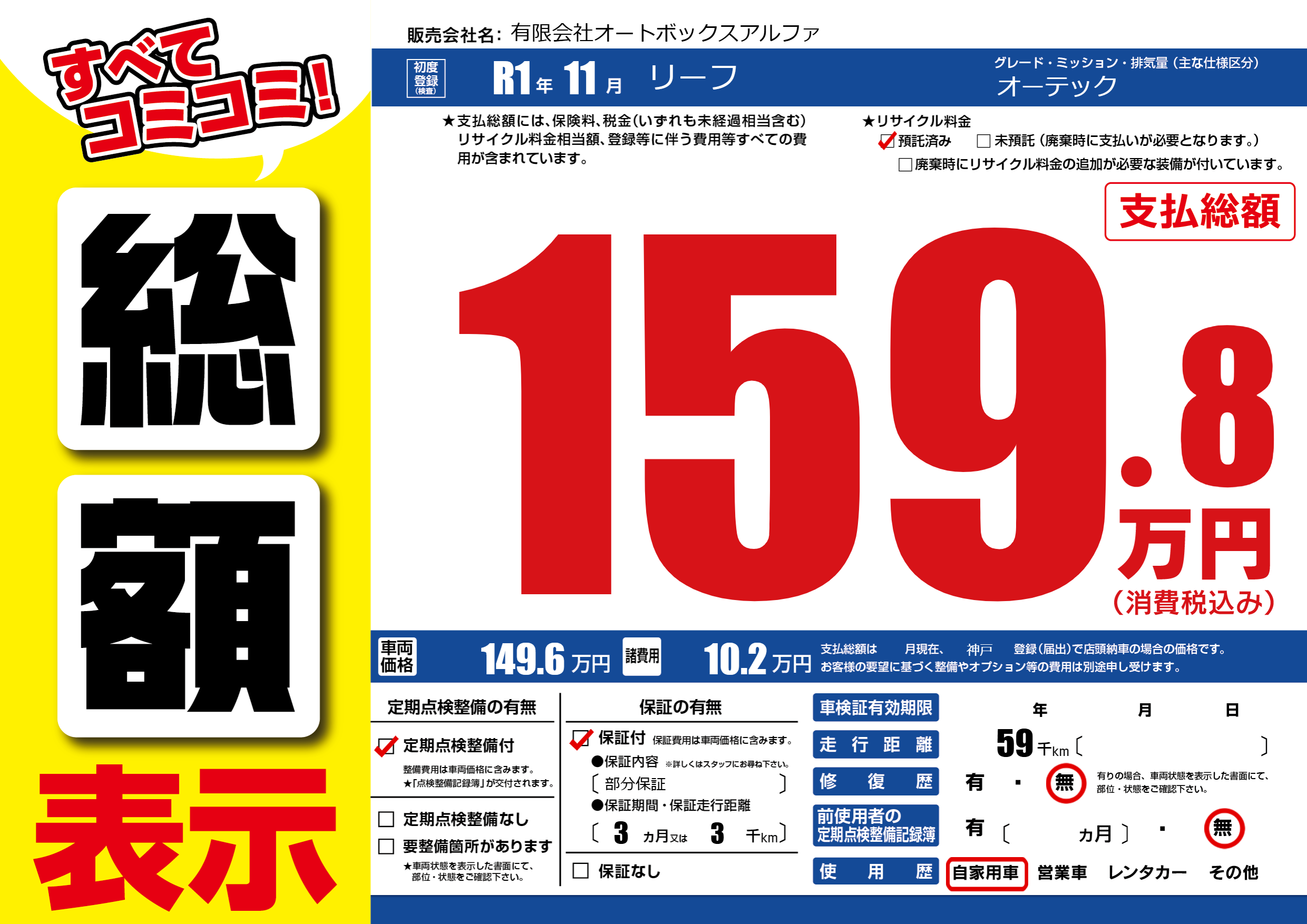 | 車名 | リーフ | グレード ミッション 排気量 |