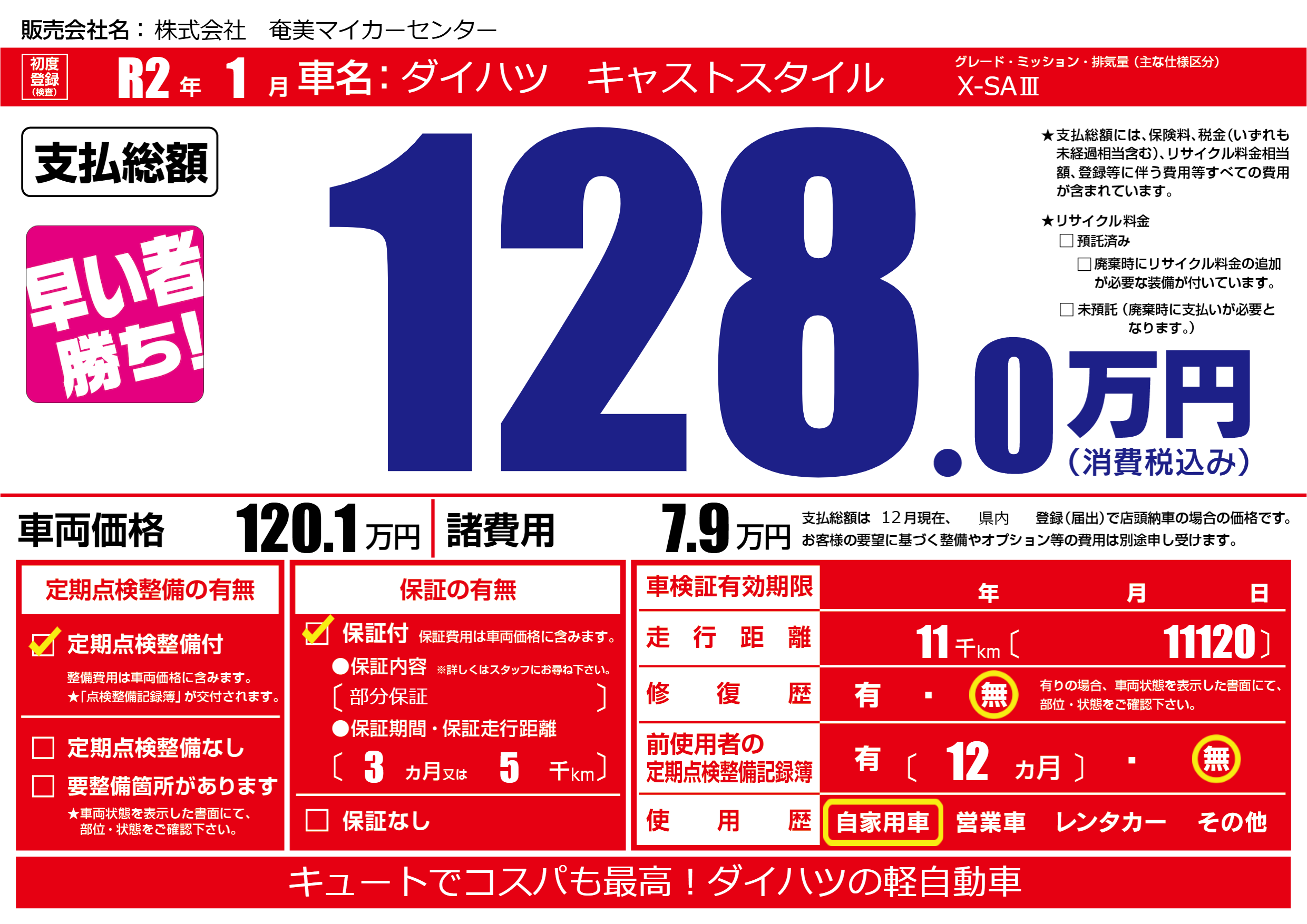| 走行キロ | 1.1万km | 初年度登録 | R2年1月 |