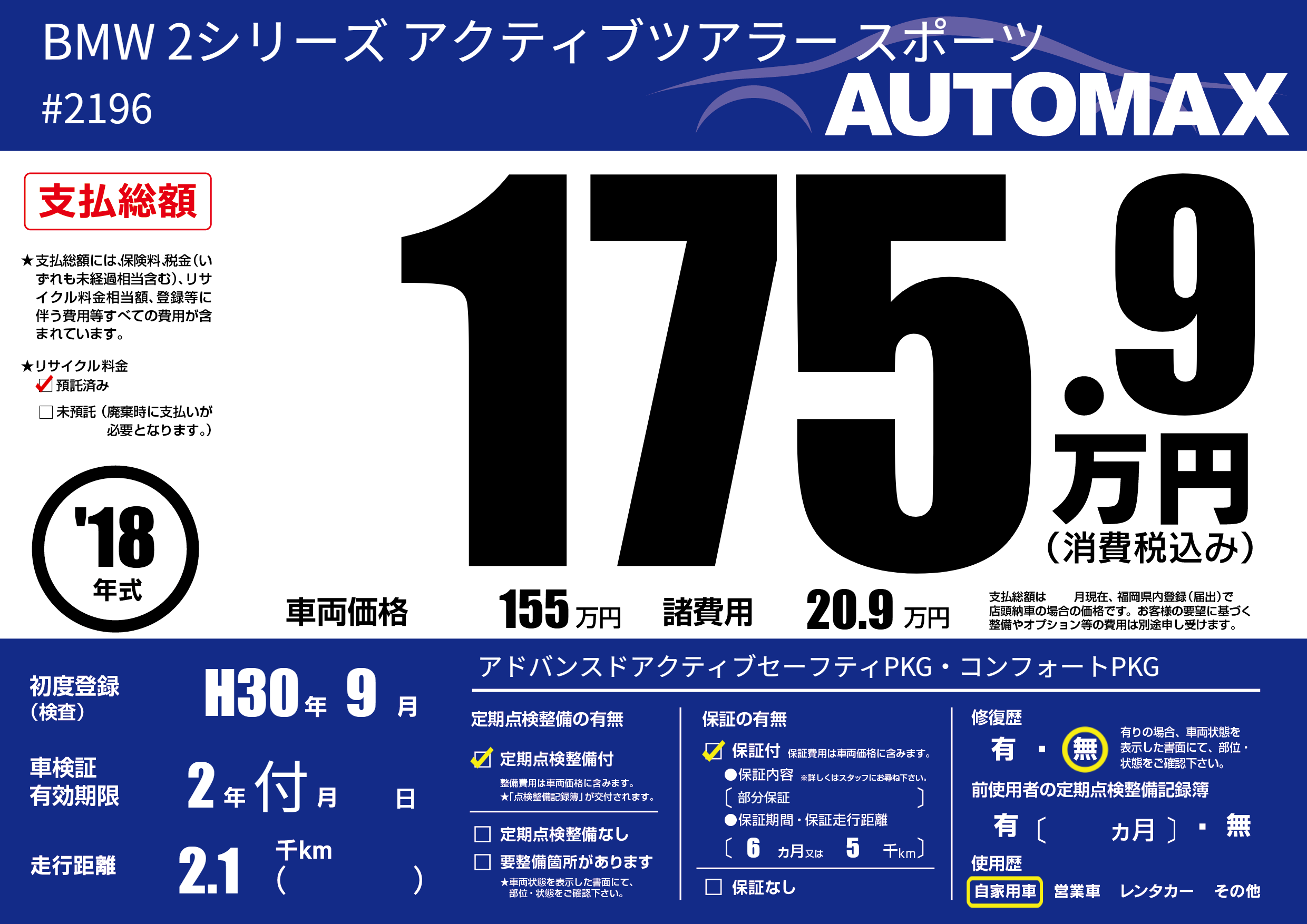| 車名 | BMW 2シリーズ アクティブツアラー スポーツ | グレード ミッション 排気量 |