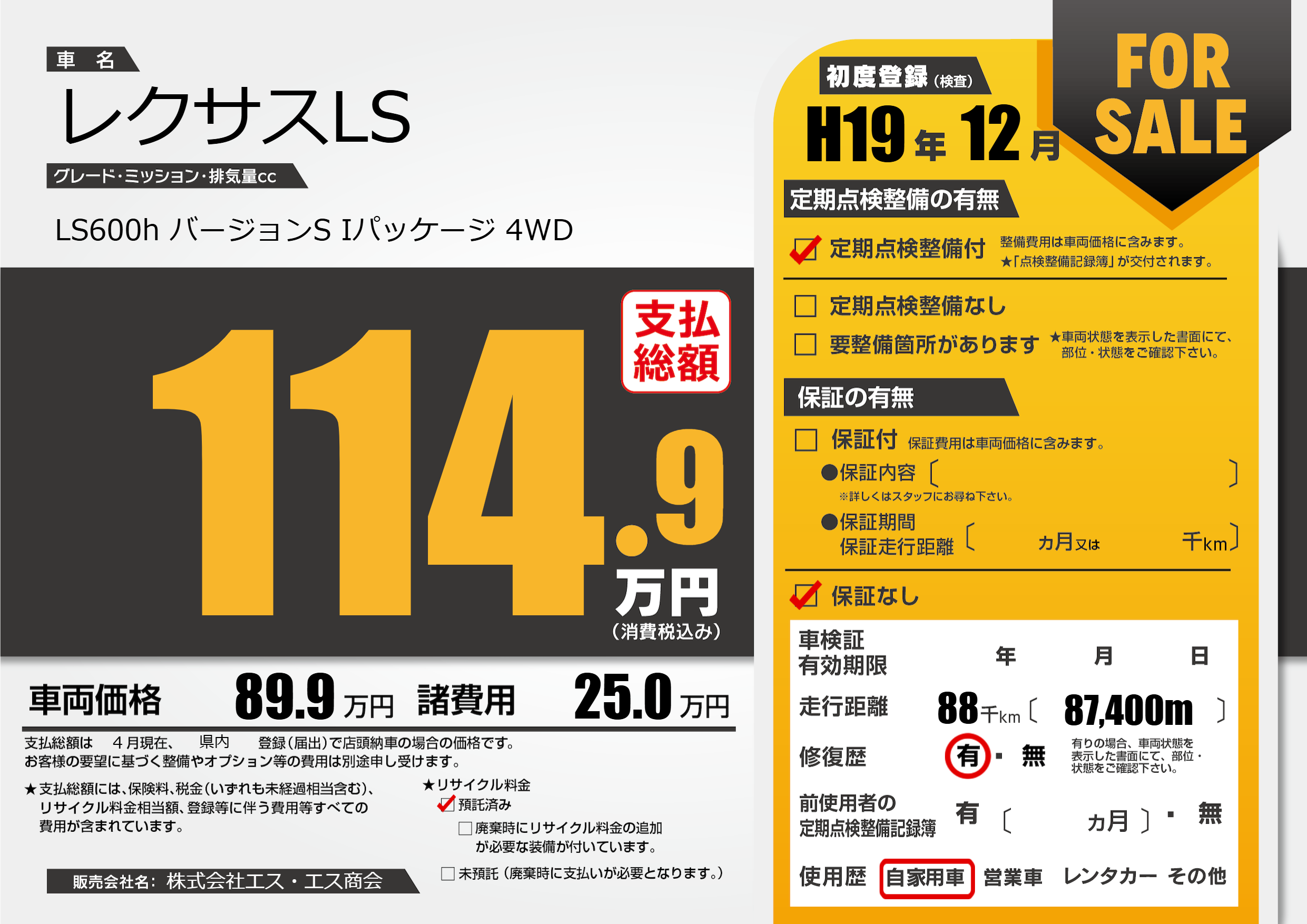 | 車名 | レクサスLS | グレード ミッション 排気量 |