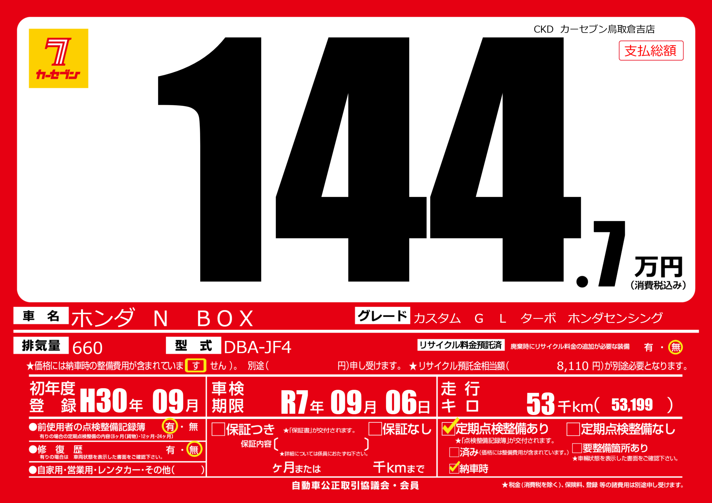 | 定期点検整備 | 定期点検整備あり 納車時あり | ||