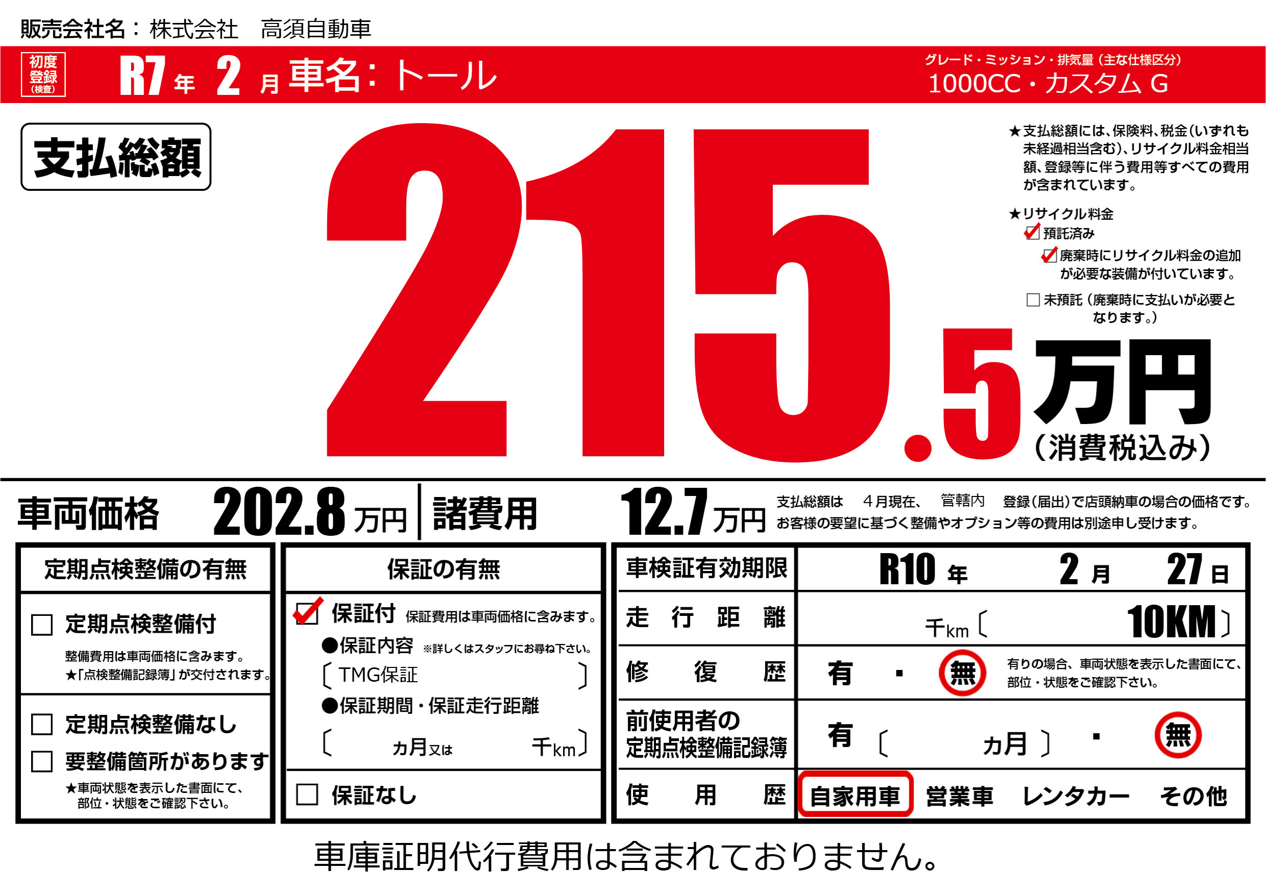 保証付き 保証内容(TMG保証) ---ヶ月または()千kmまで |
