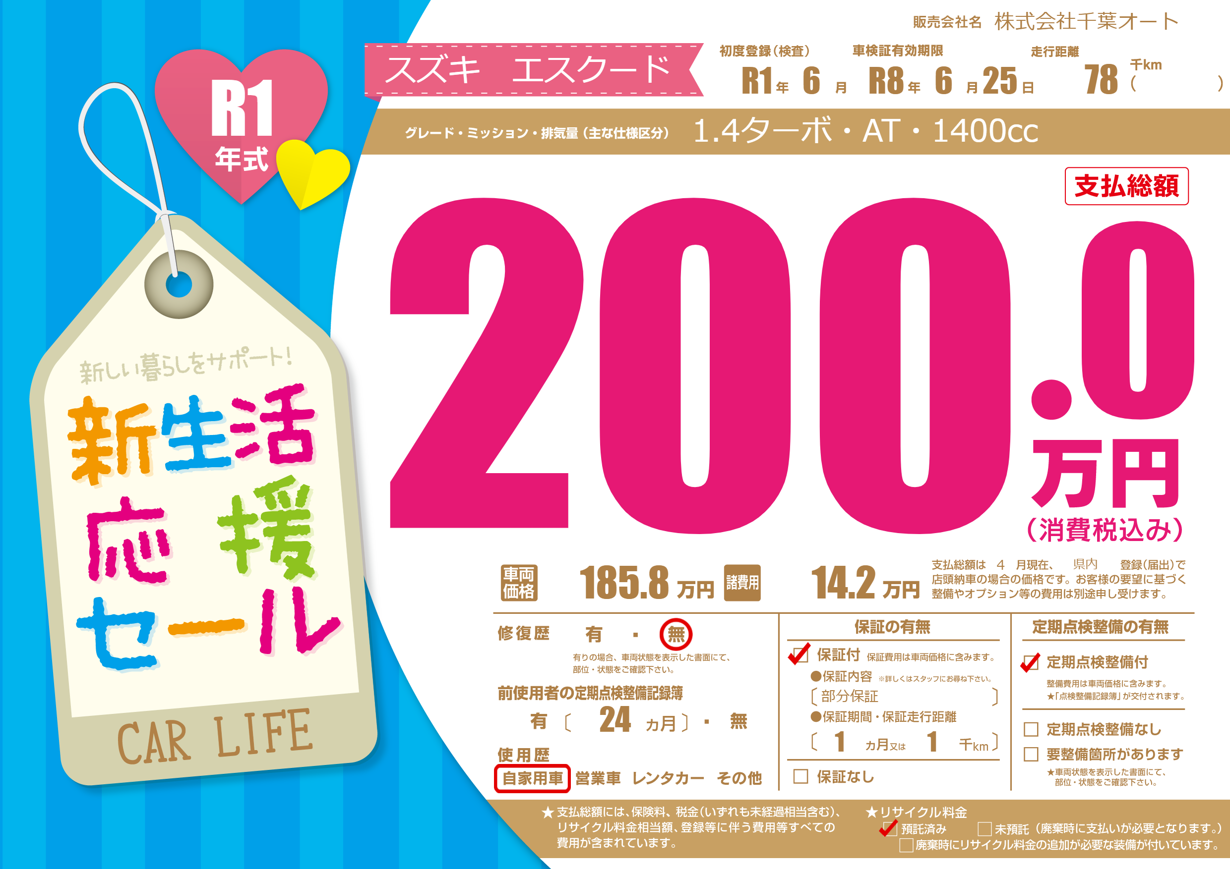 | 走行キロ | 7.8万km | 初年度登録 | R1年6月 |