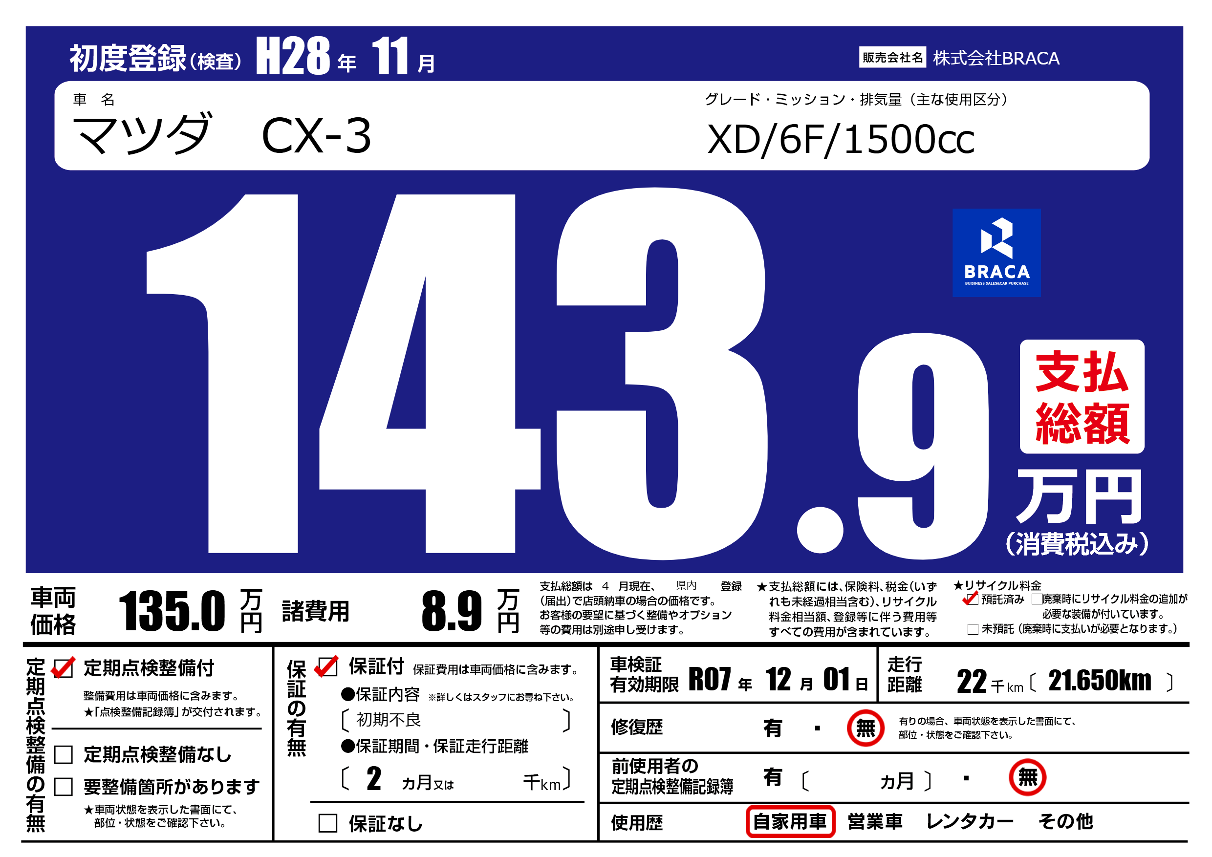 | 車名 | マツダ CX-3 | グレード ミッション 排気量 |