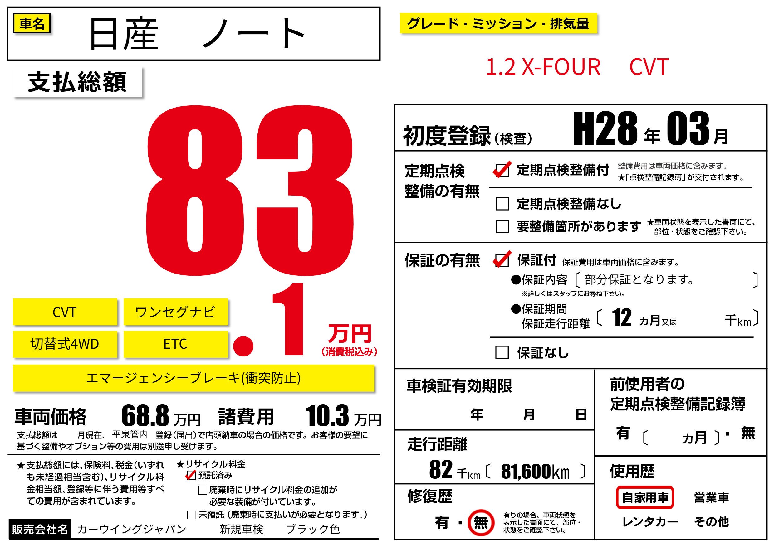 | 車名 | 日産 ノート | グレード ミッション 排気量 |