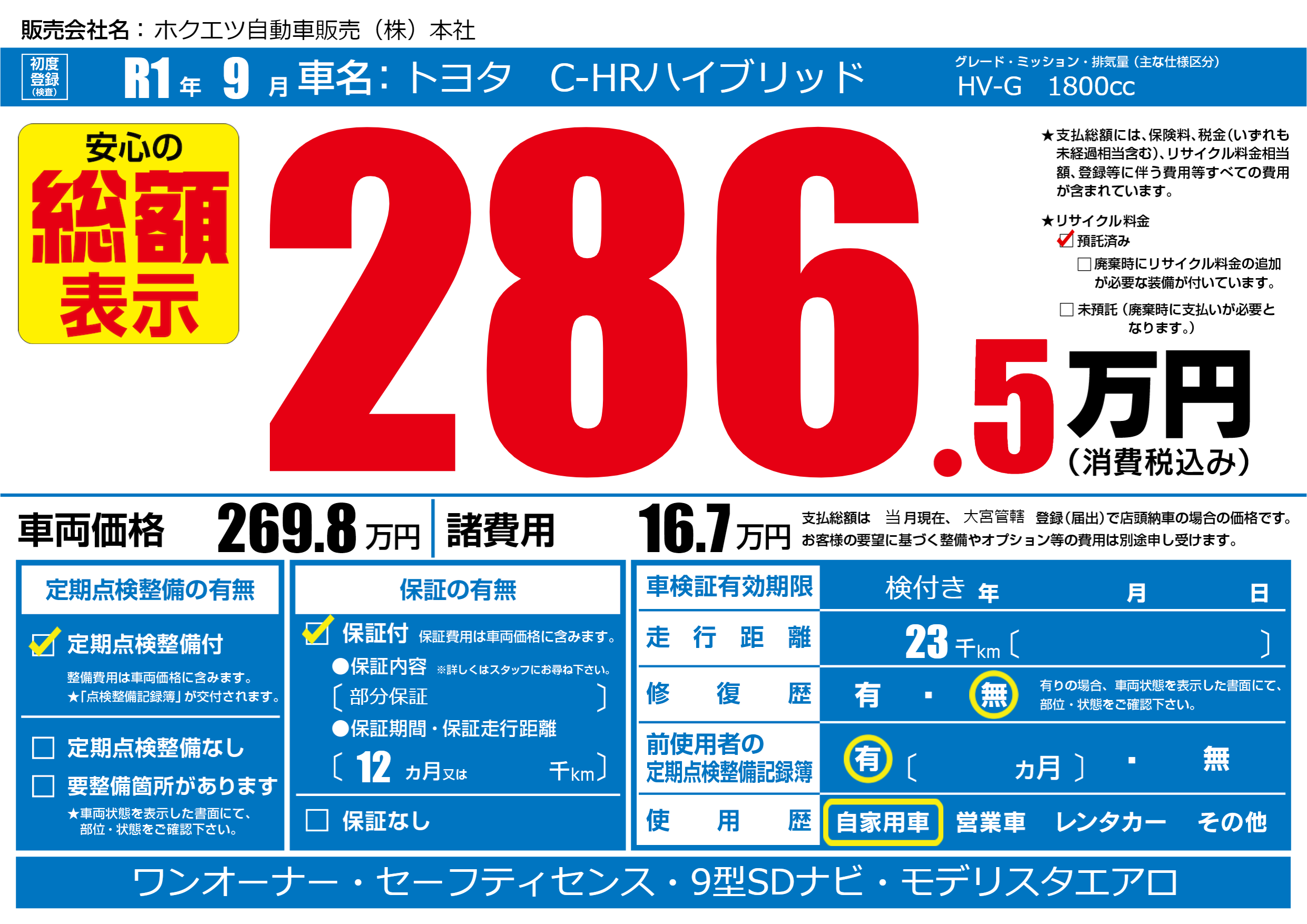 | 車名 | トヨタ C-HRハイブリッド | グレード ミッション 排気量 |