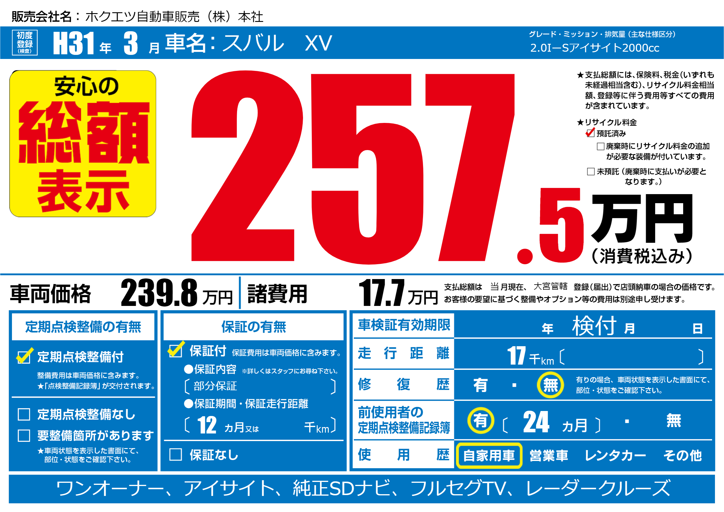| 車名 | スバル XV | グレード ミッション 排気量 |