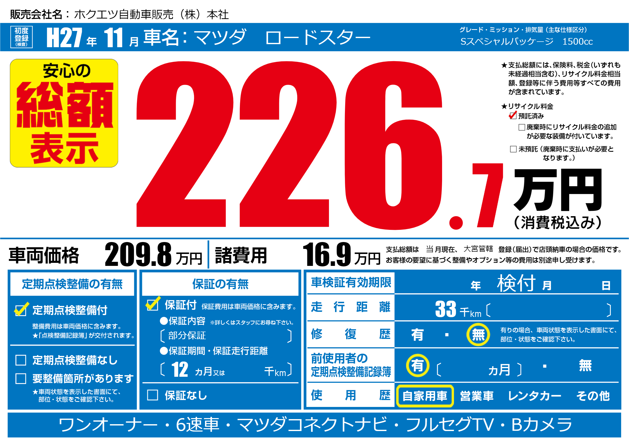| 走行キロ | 3.3万km | 初年度登録 | H27年11月 |