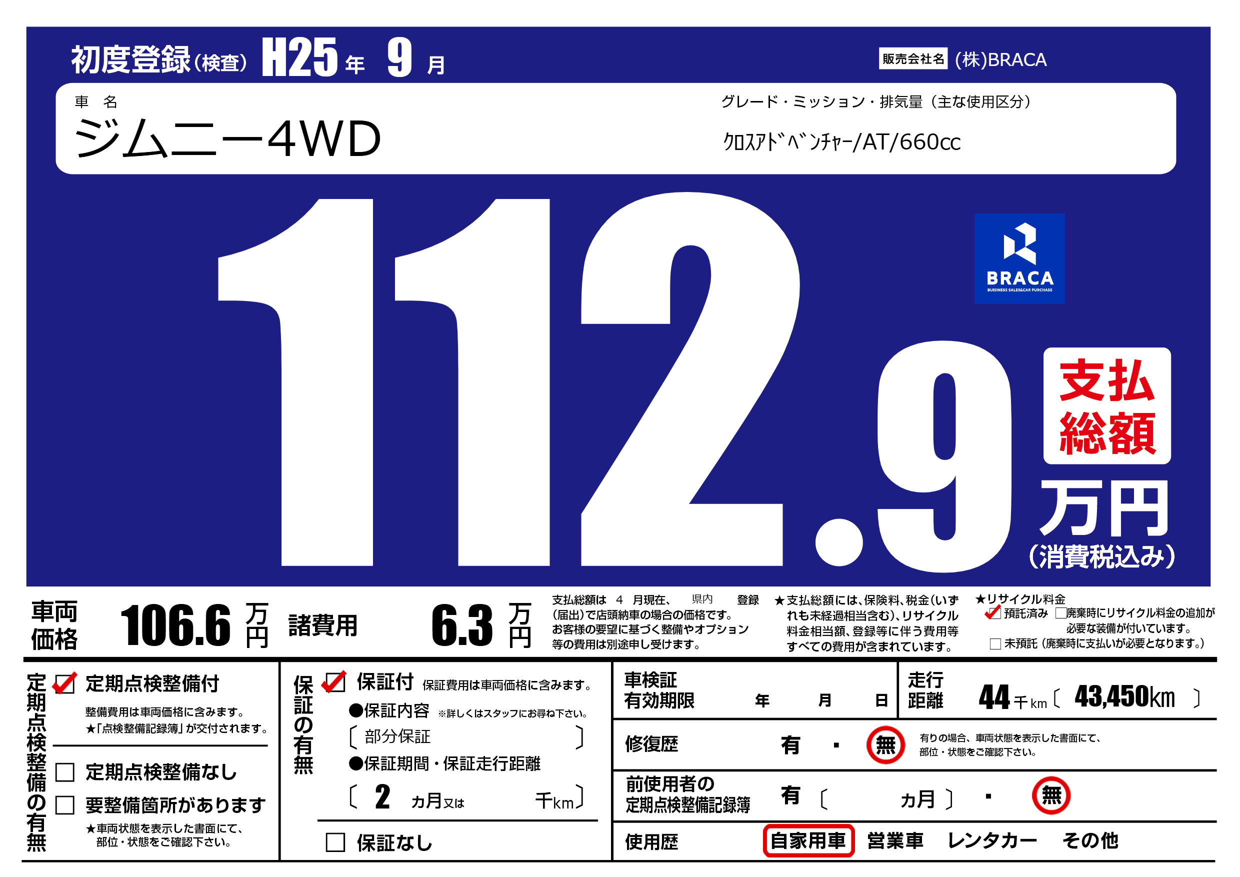 | 車名 | ジムニー4WD | グレード ミッション 排気量 |