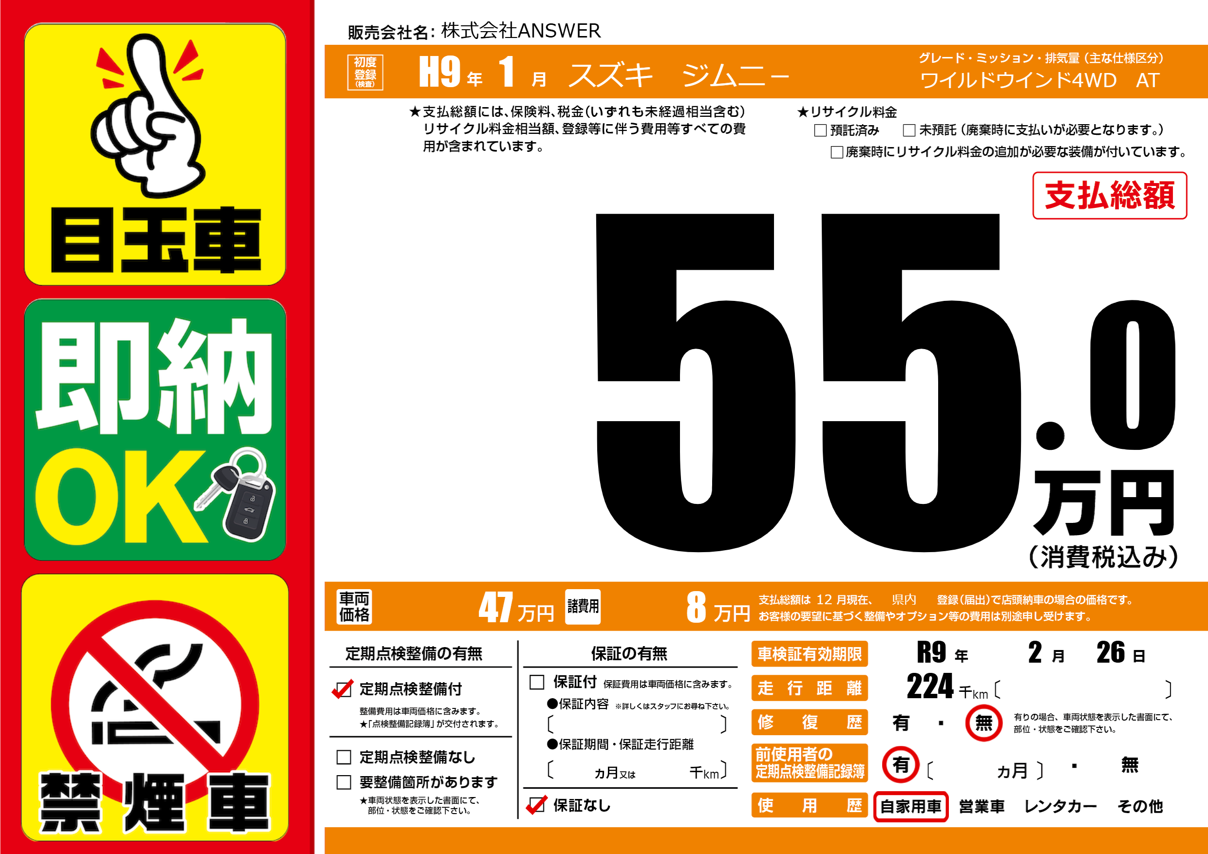 | 走行キロ | 22.4万km | 初年度登録 | H9年1月 |