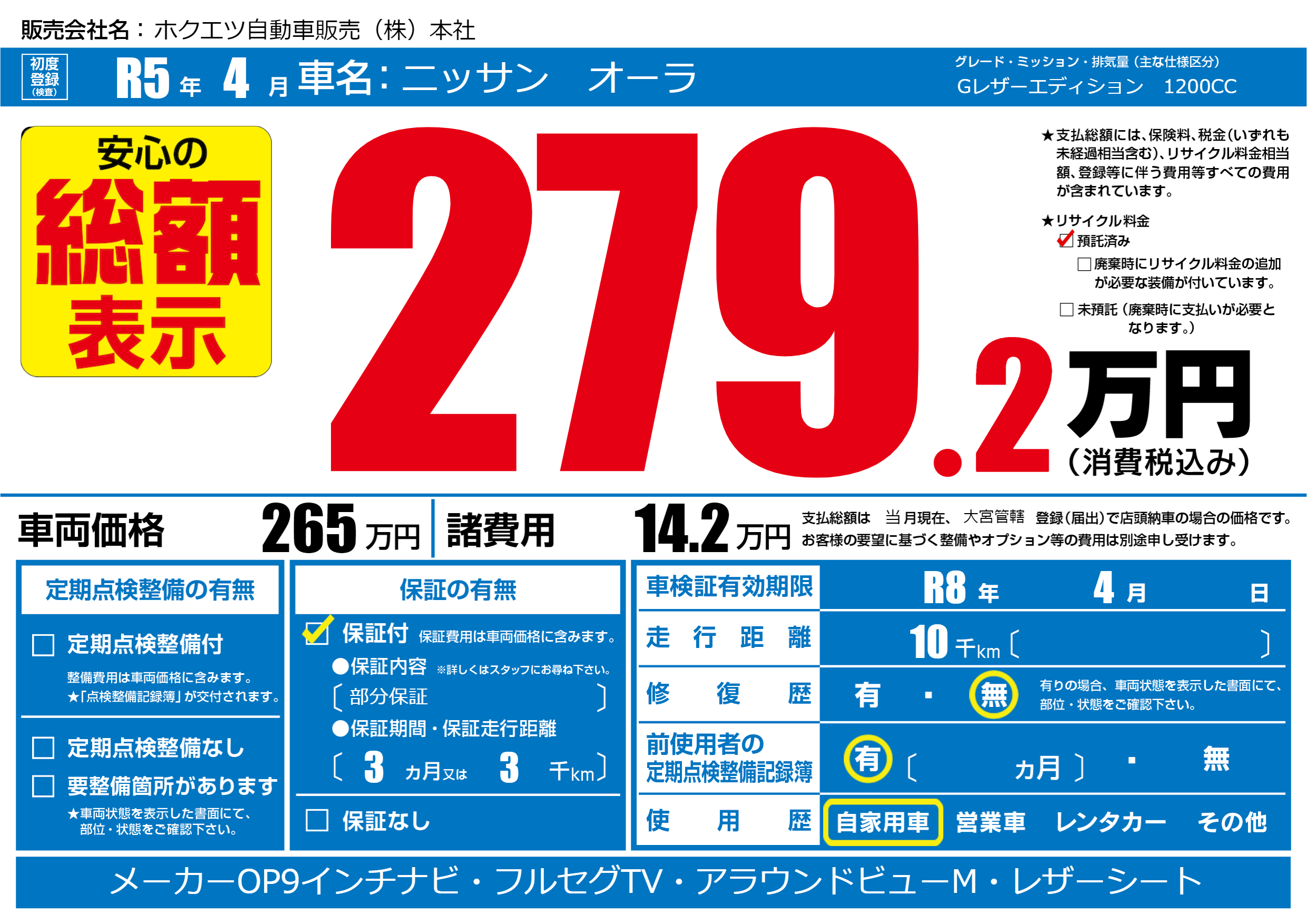 | 車名 | ニッサン オーラ | グレード ミッション 排気量 |