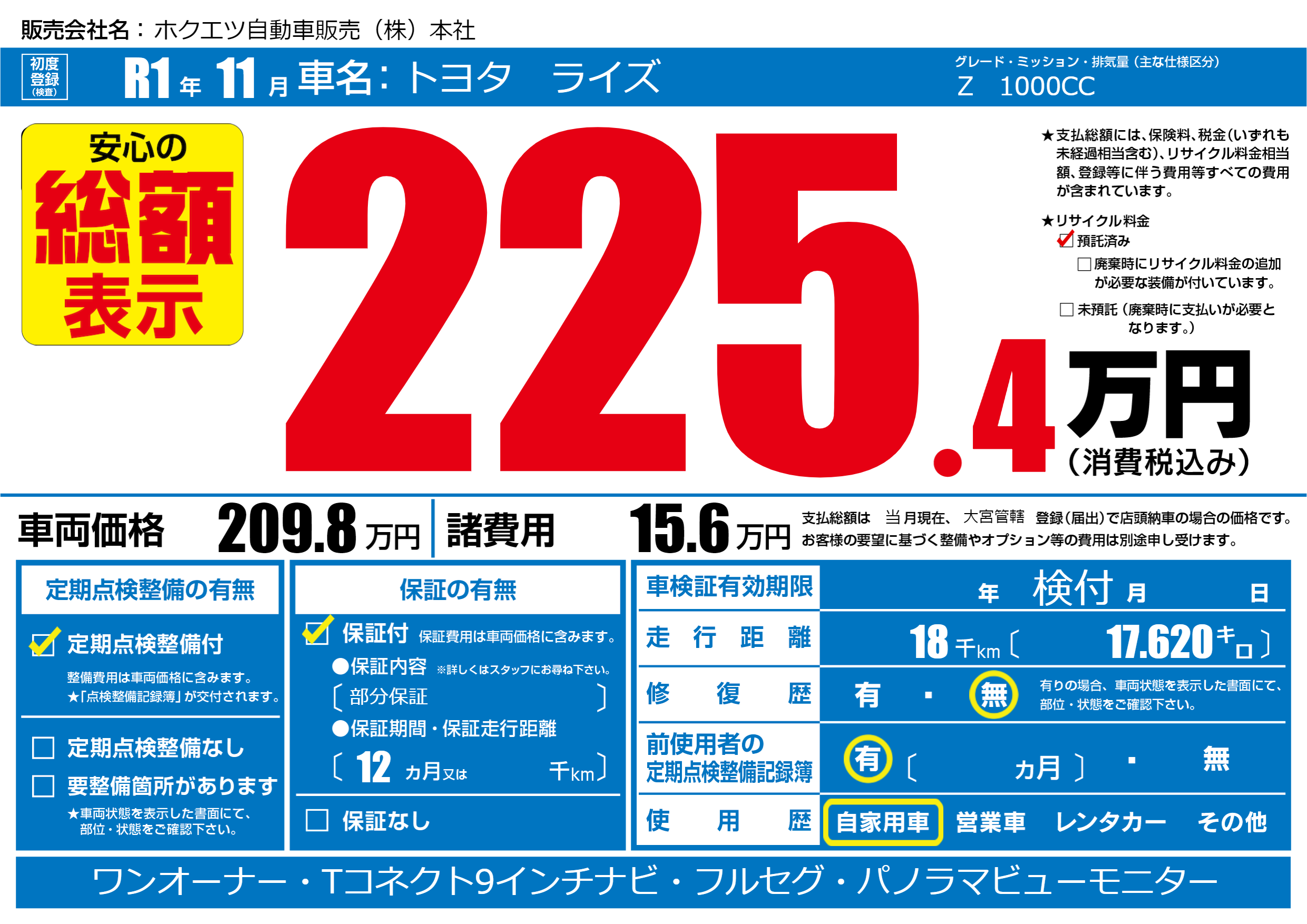 | 走行キロ | 1.8万km | 初年度登録 | R1年11月 |