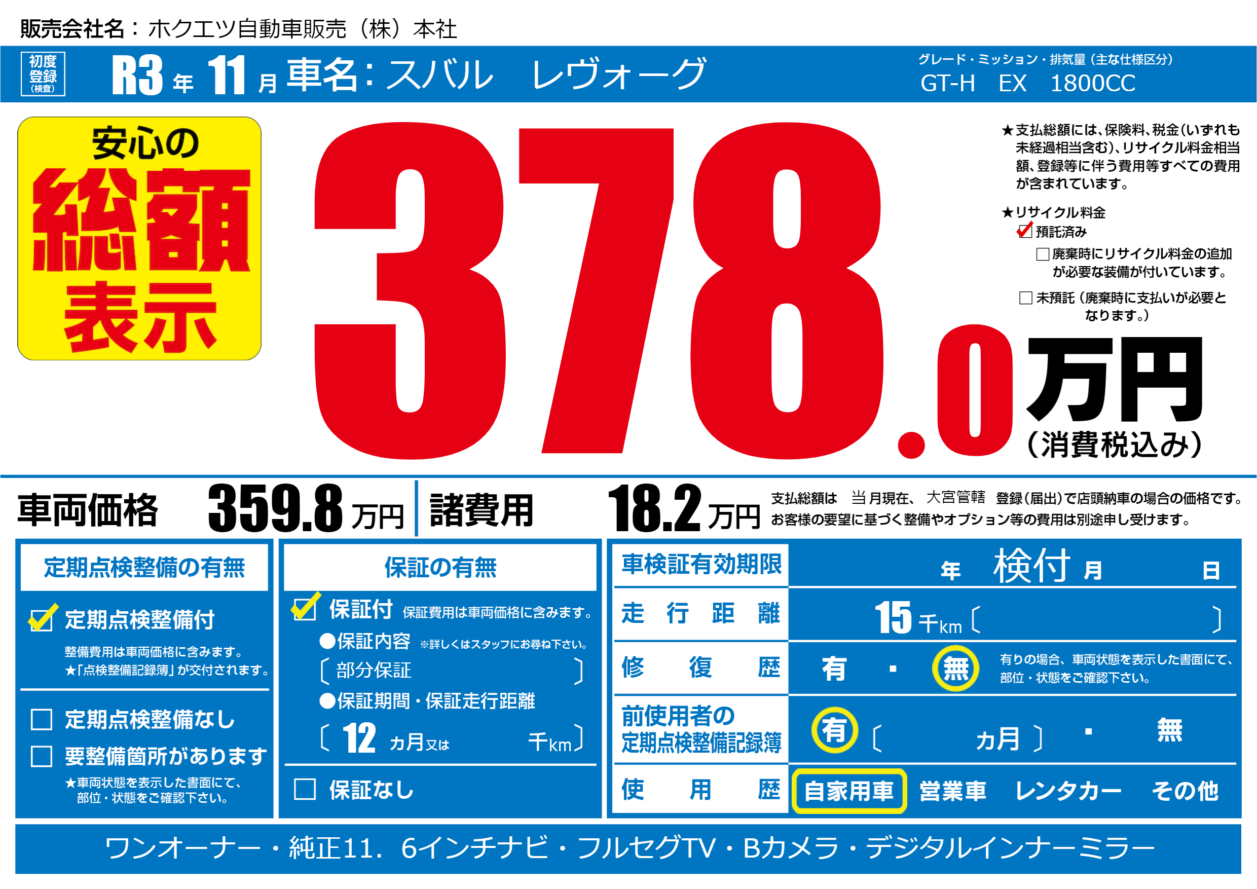 | 車名 | スバル レヴォーグ | グレード ミッション 排気量 |