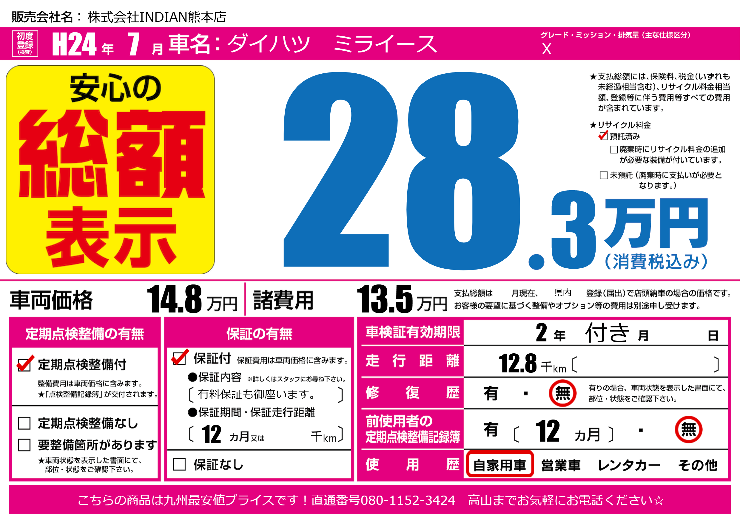 | 走行キロ | 1.2万km | 初年度登録 | H24年7月 |