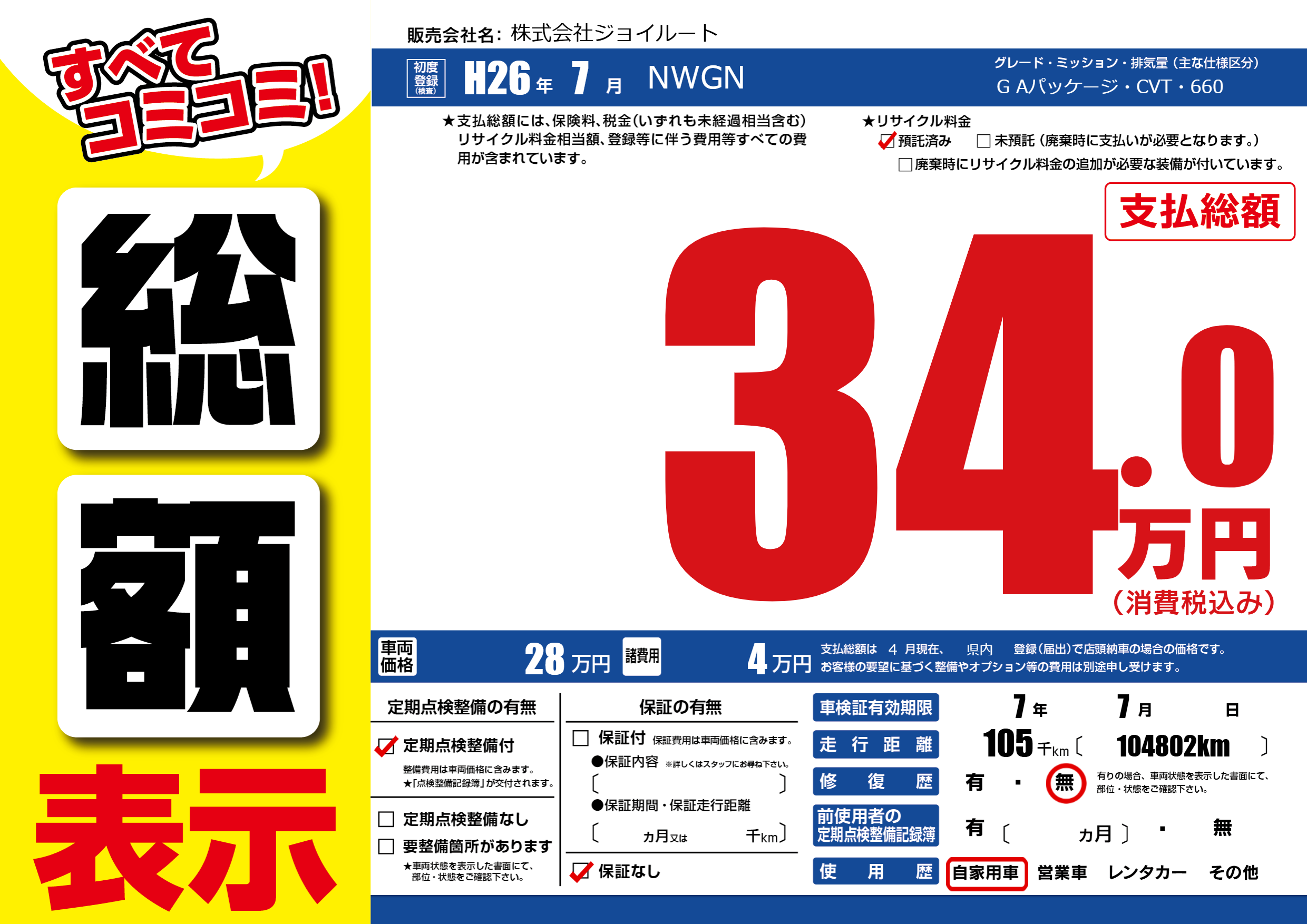 | 車名 | NWGN | グレード ミッション 排気量 |