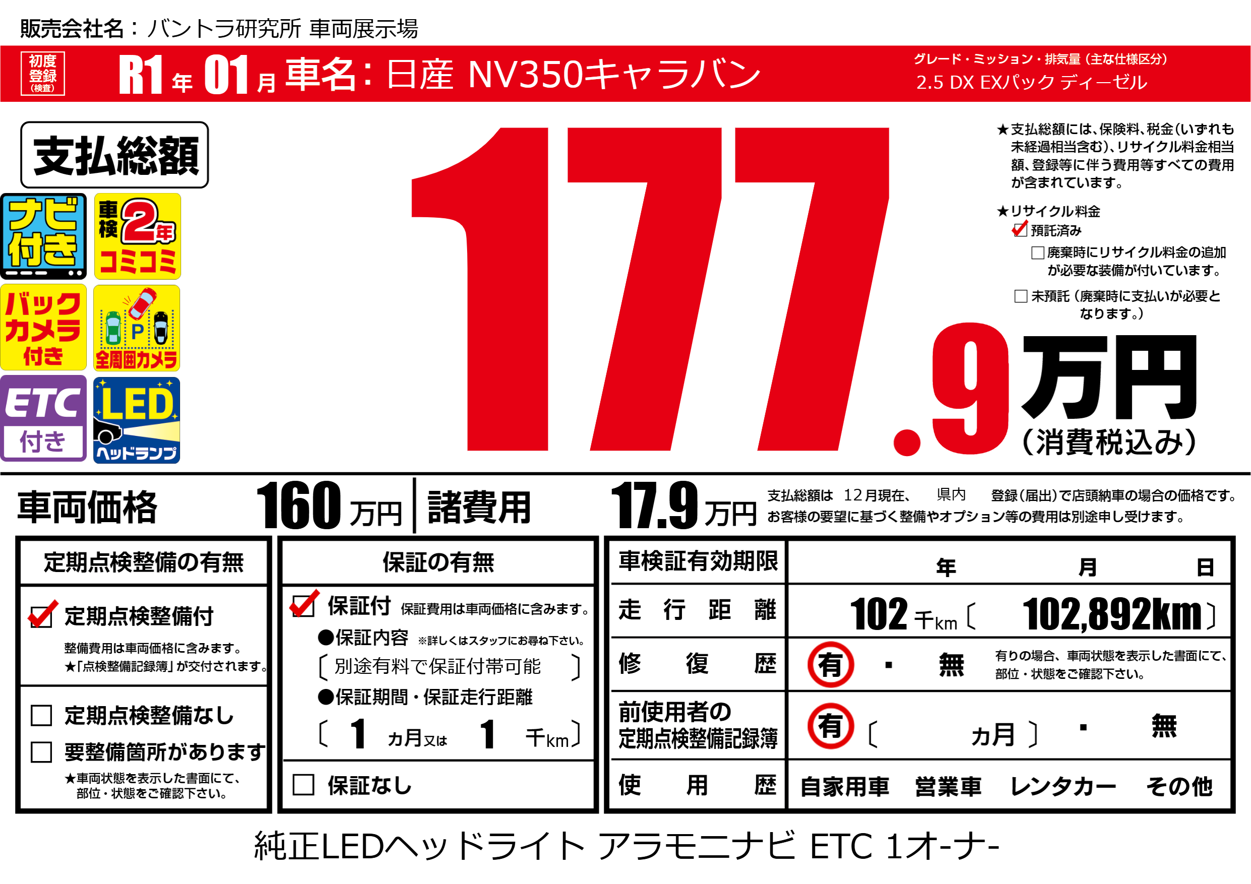 | 車名 | 日産 NV350キャラバン | グレード ミッション 排気量 |