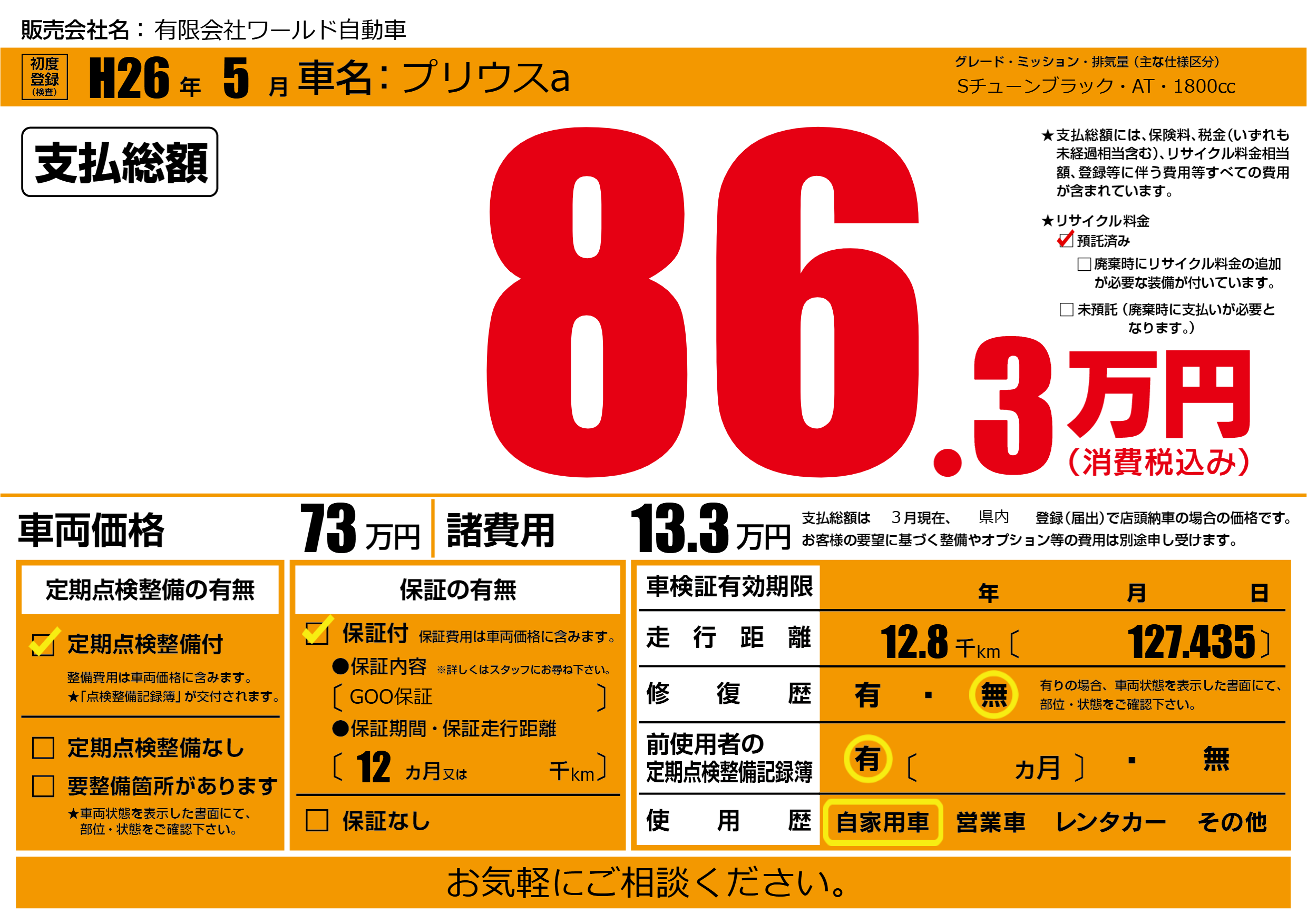 保証付き 保証内容(GOO保証) 12ヶ月または千km |