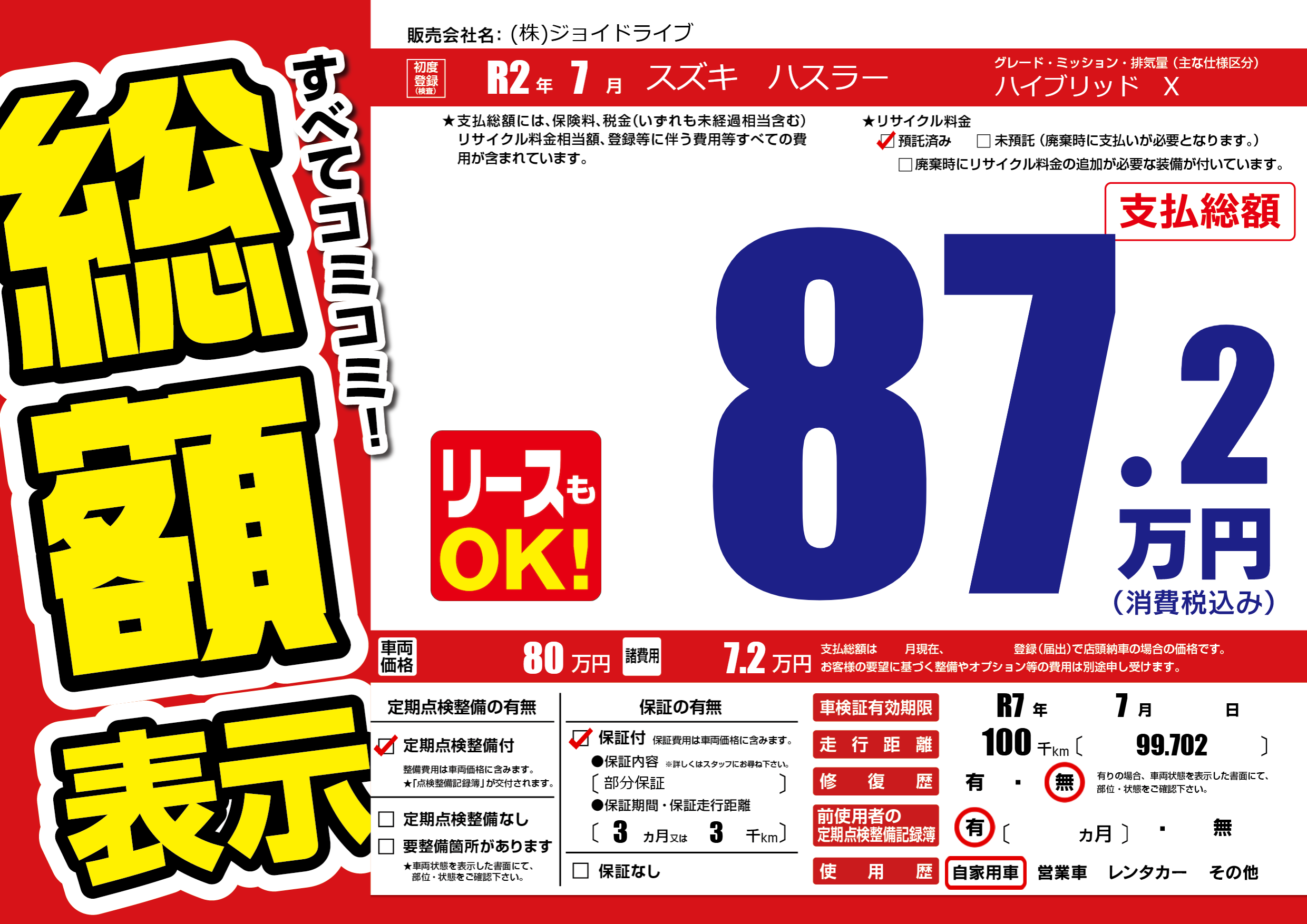 | 走行キロ | 10万km | 初年度登録 | R2年7月 |