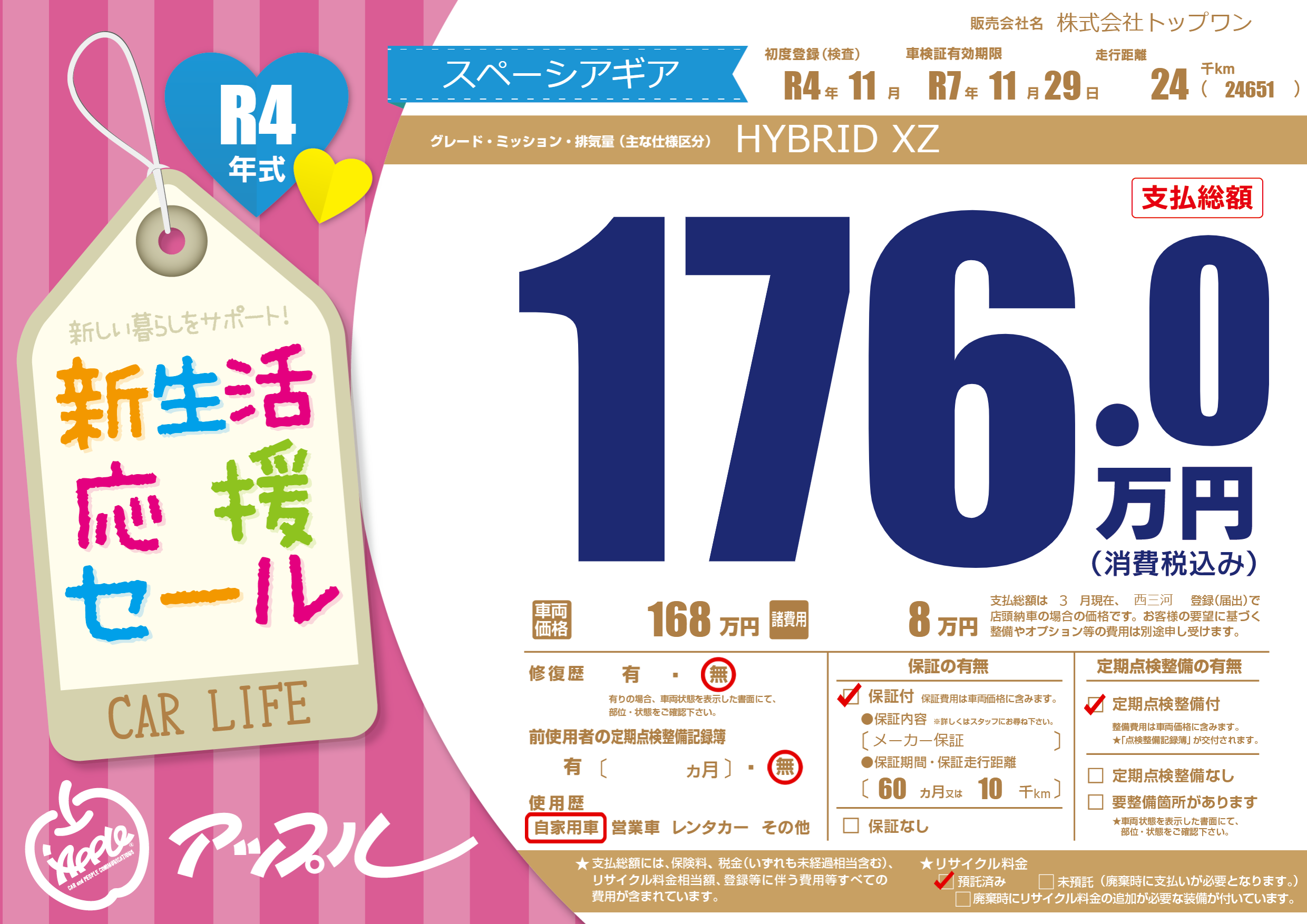 | 走行キロ | 2.4万km | 初年度登録 | R4年11月 |