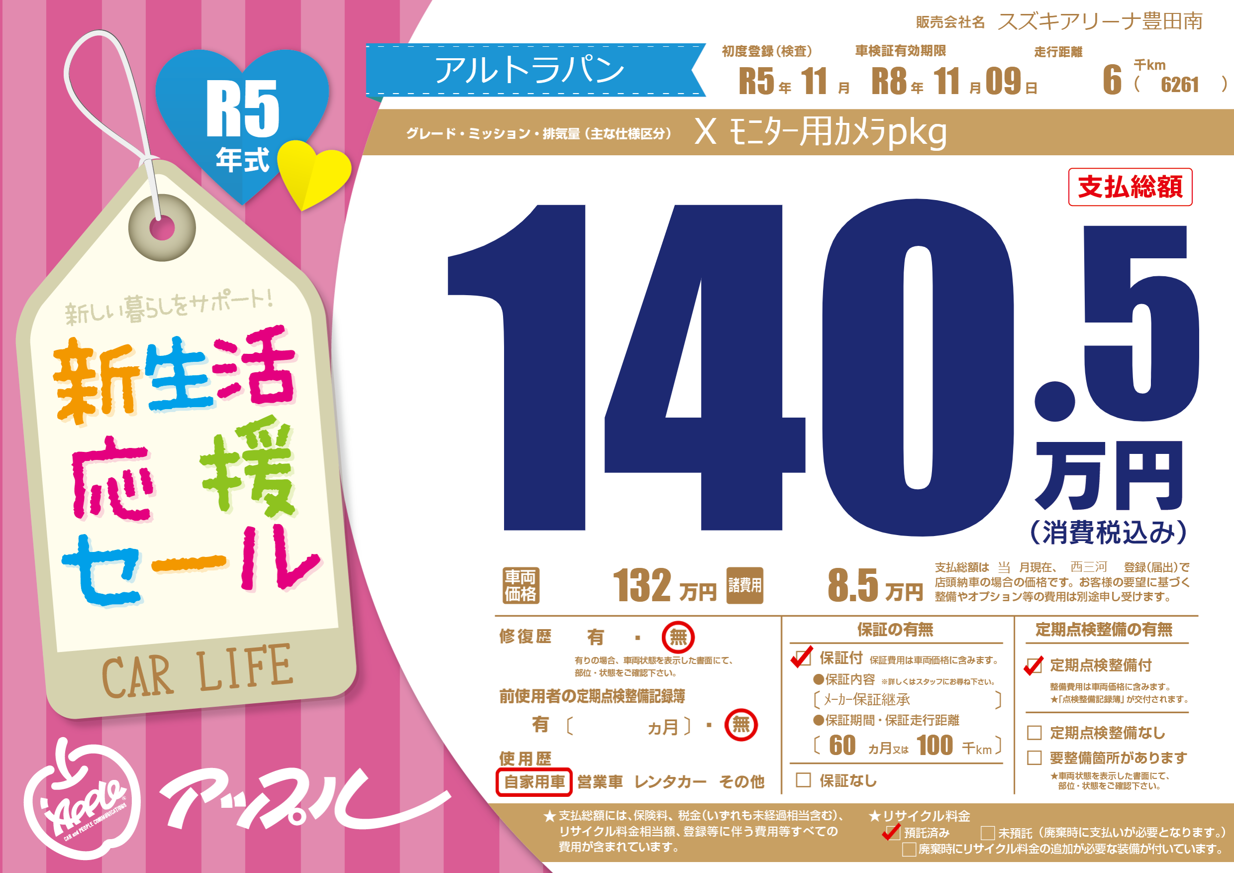 | 走行キロ | 0.6万km | 初年度登録 | R5年11月 |
