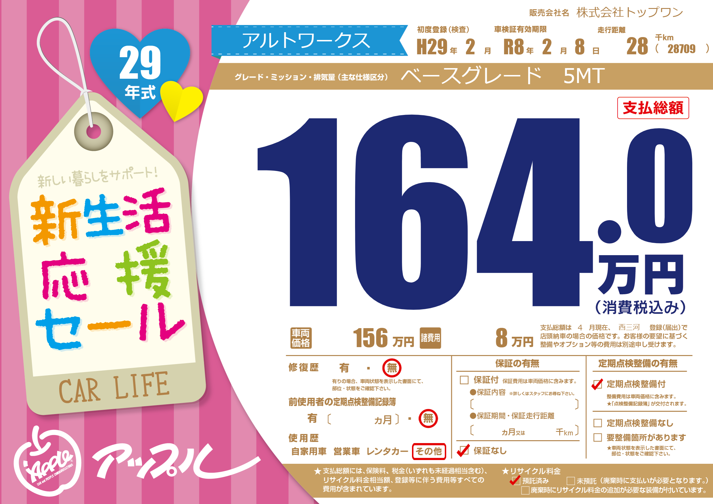| 走行キロ | 2.8万km | 初年度登録 | H29年2月 |