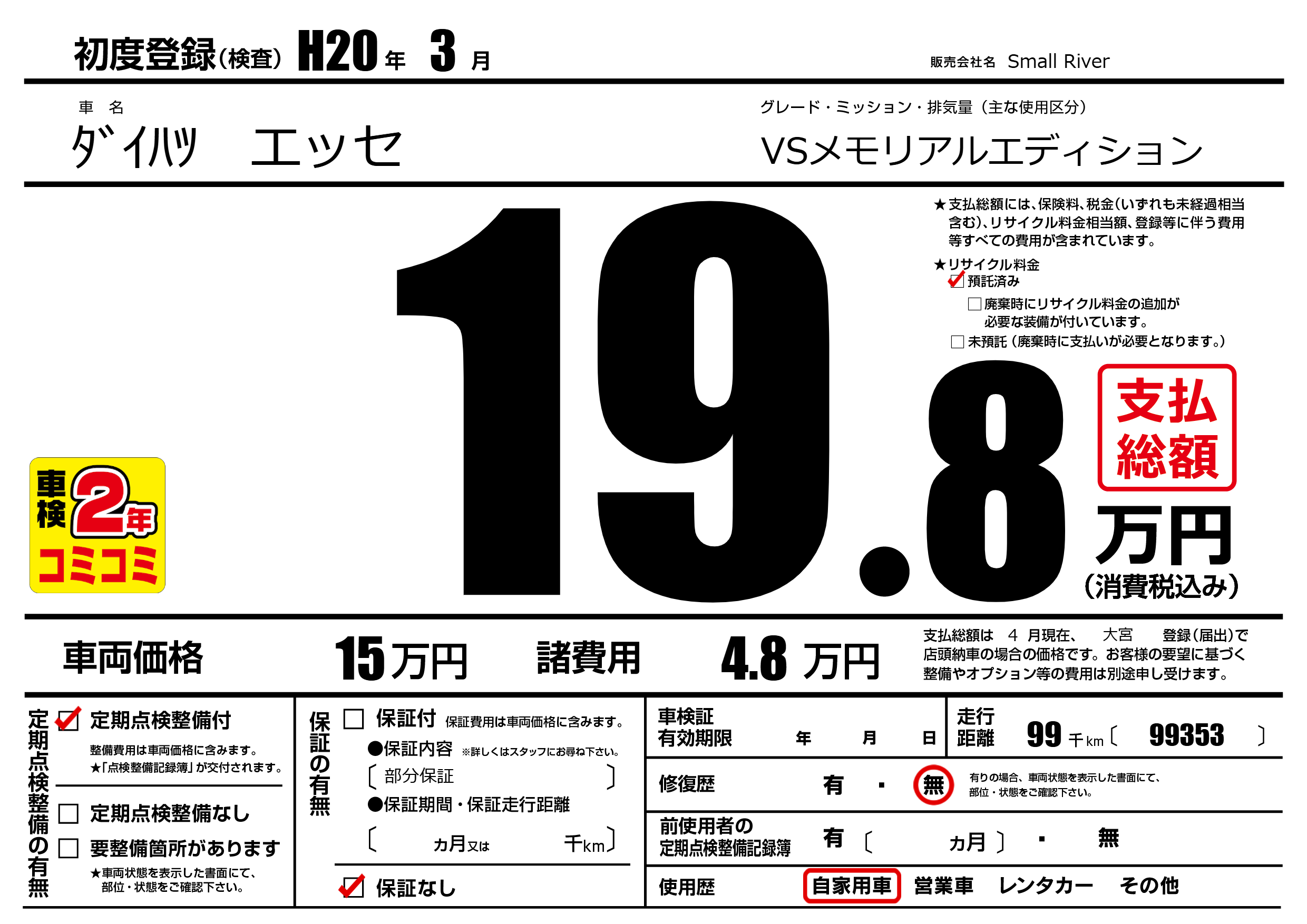 | 車名 | ダイハツ エッセ | グレード ミッション 排気量 |