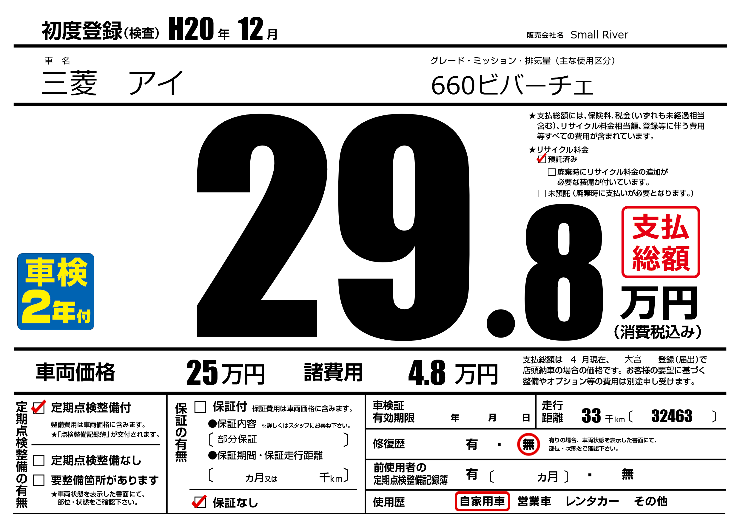 | 走行キロ | 3.3万km | 初年度登録 | H20年12月 |