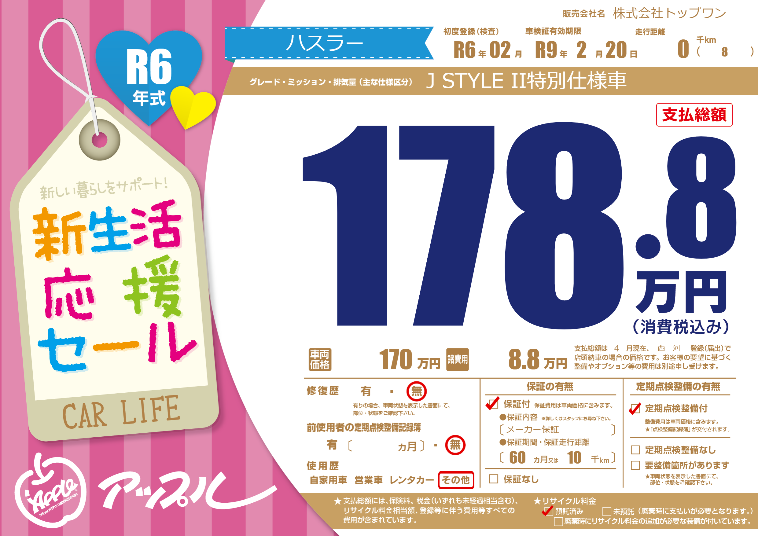 | 車名 | ハスラー | グレード ミッション 排気量 |
