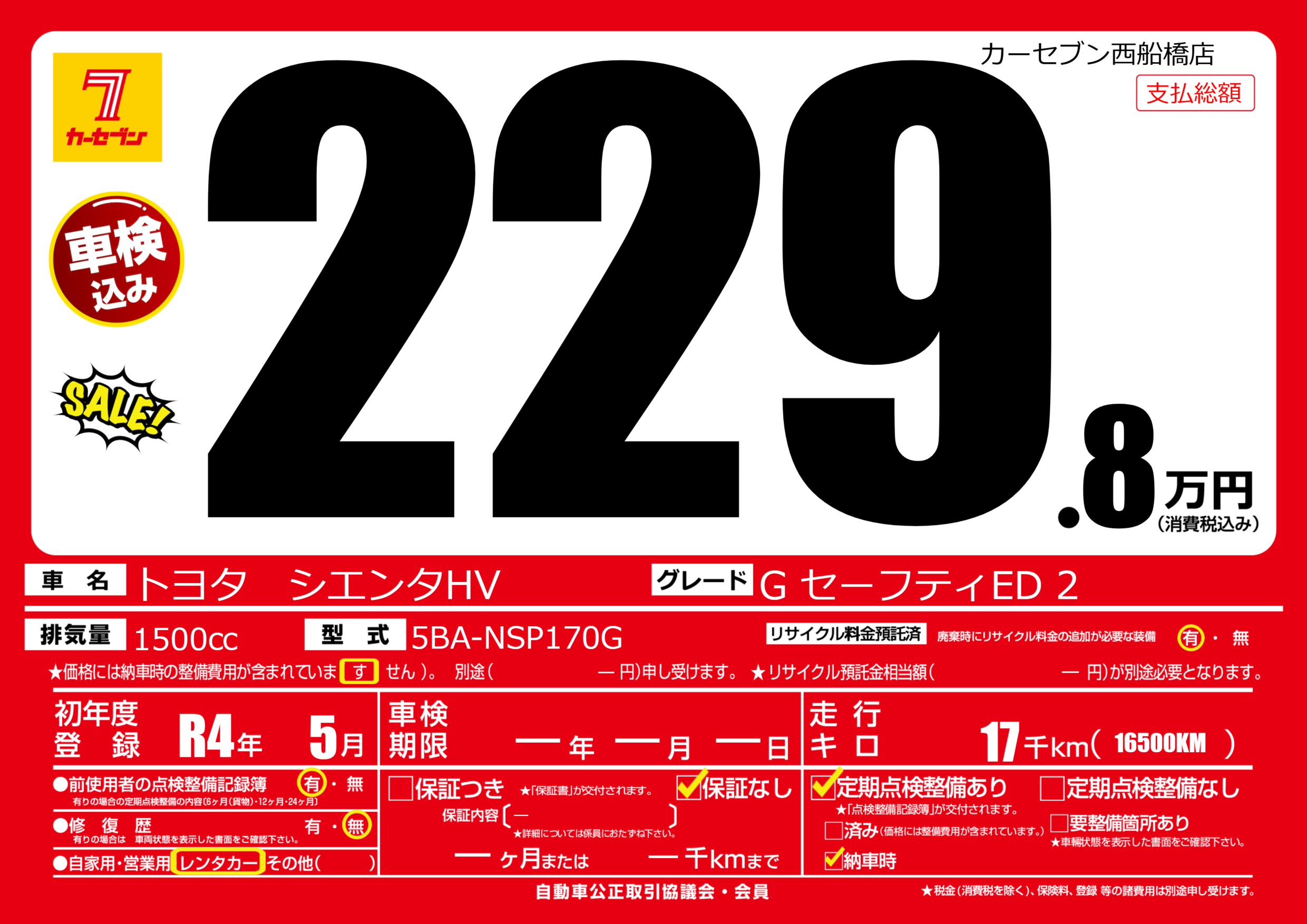 | 車名 | トヨタ シエンタHV | グレード ミッション 排気量 |