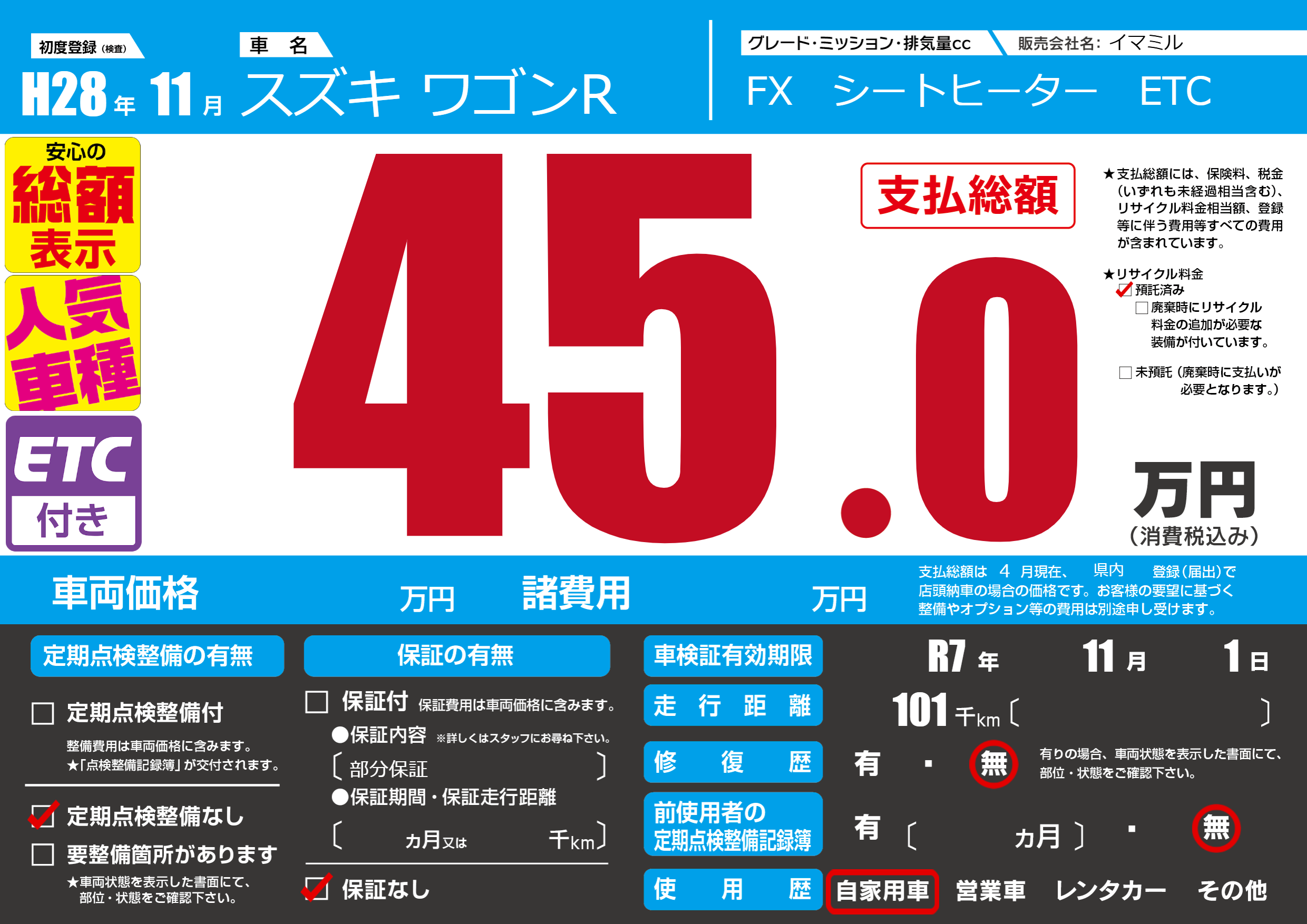 | 走行キロ | 10.1万km | 初年度登録 | H28年11月 |