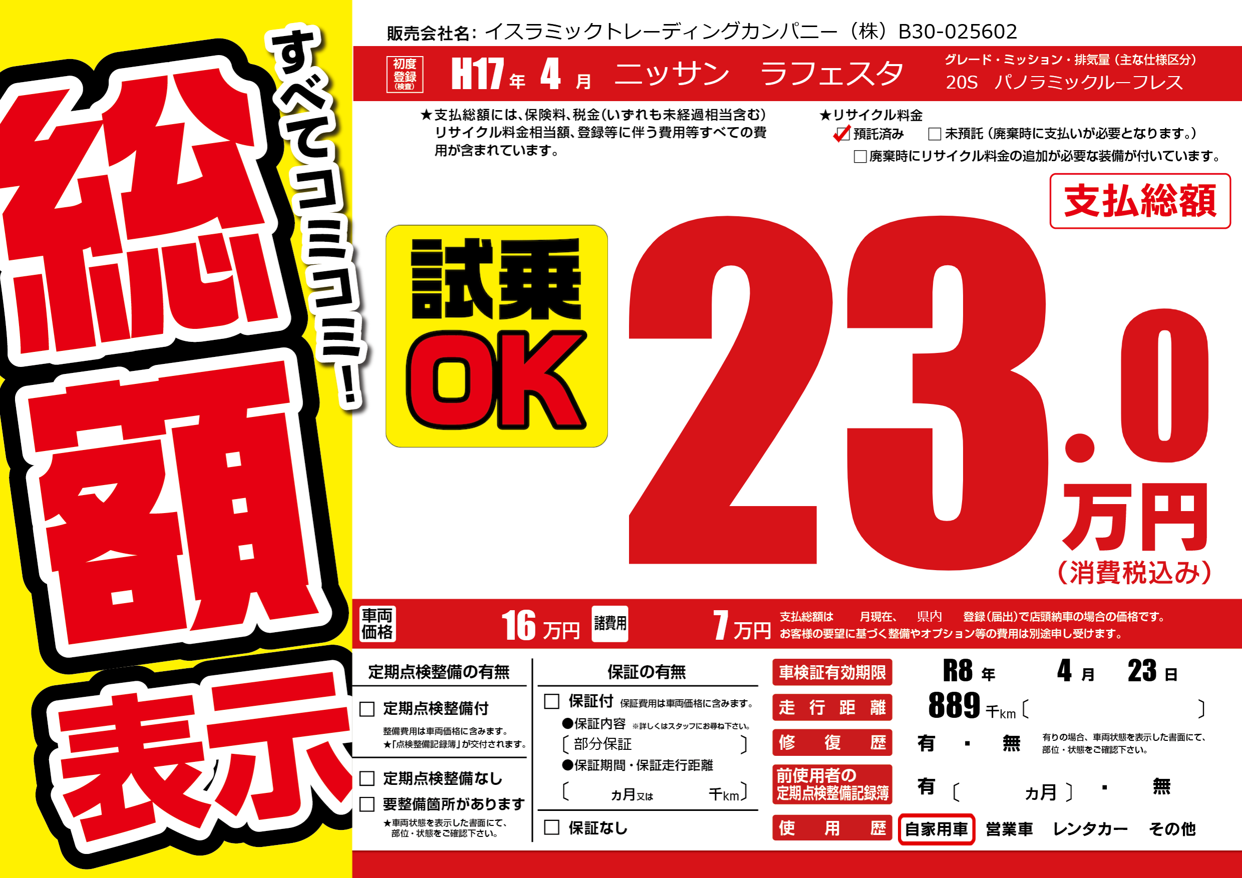| 走行キロ | 88.9万km | 初年度登録 | H17年4月 |