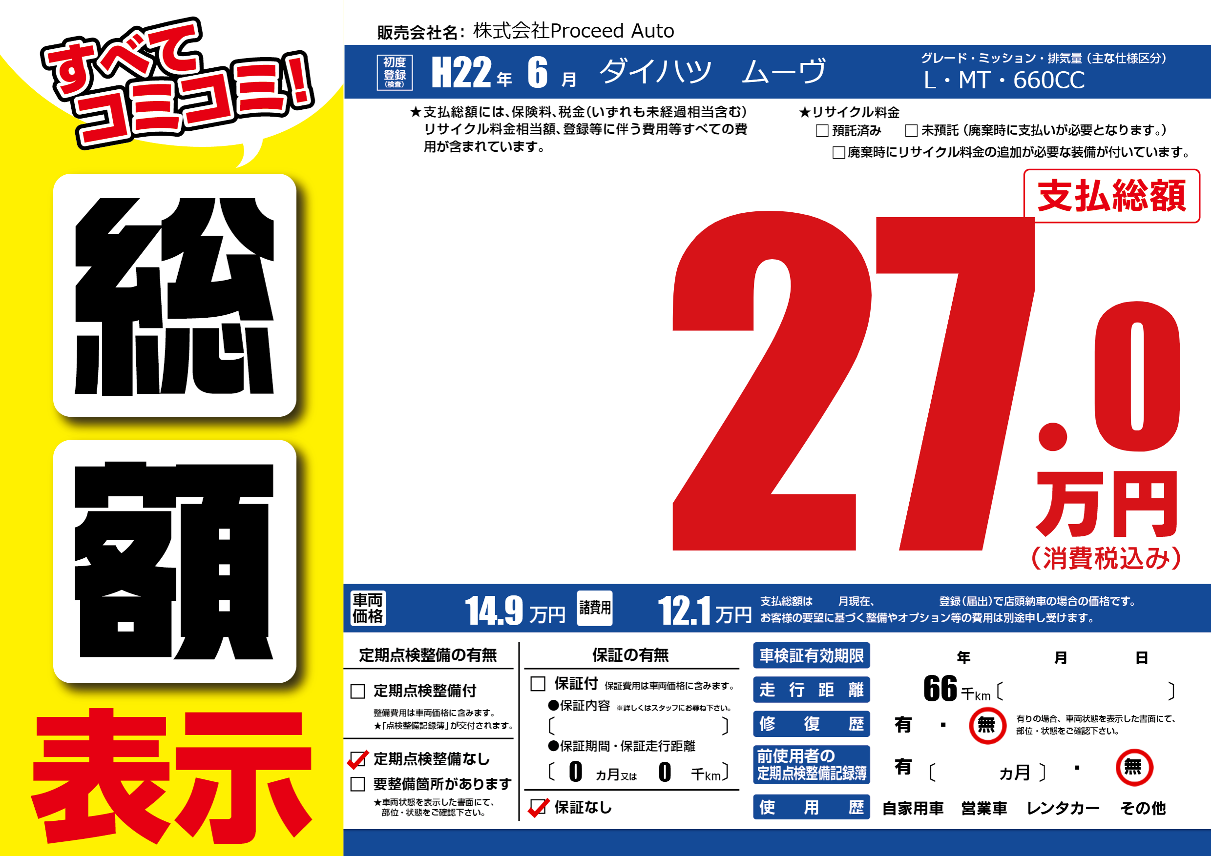 | 車名 | ダイハツ ムーヴ | グレード ミッション 排気量 |