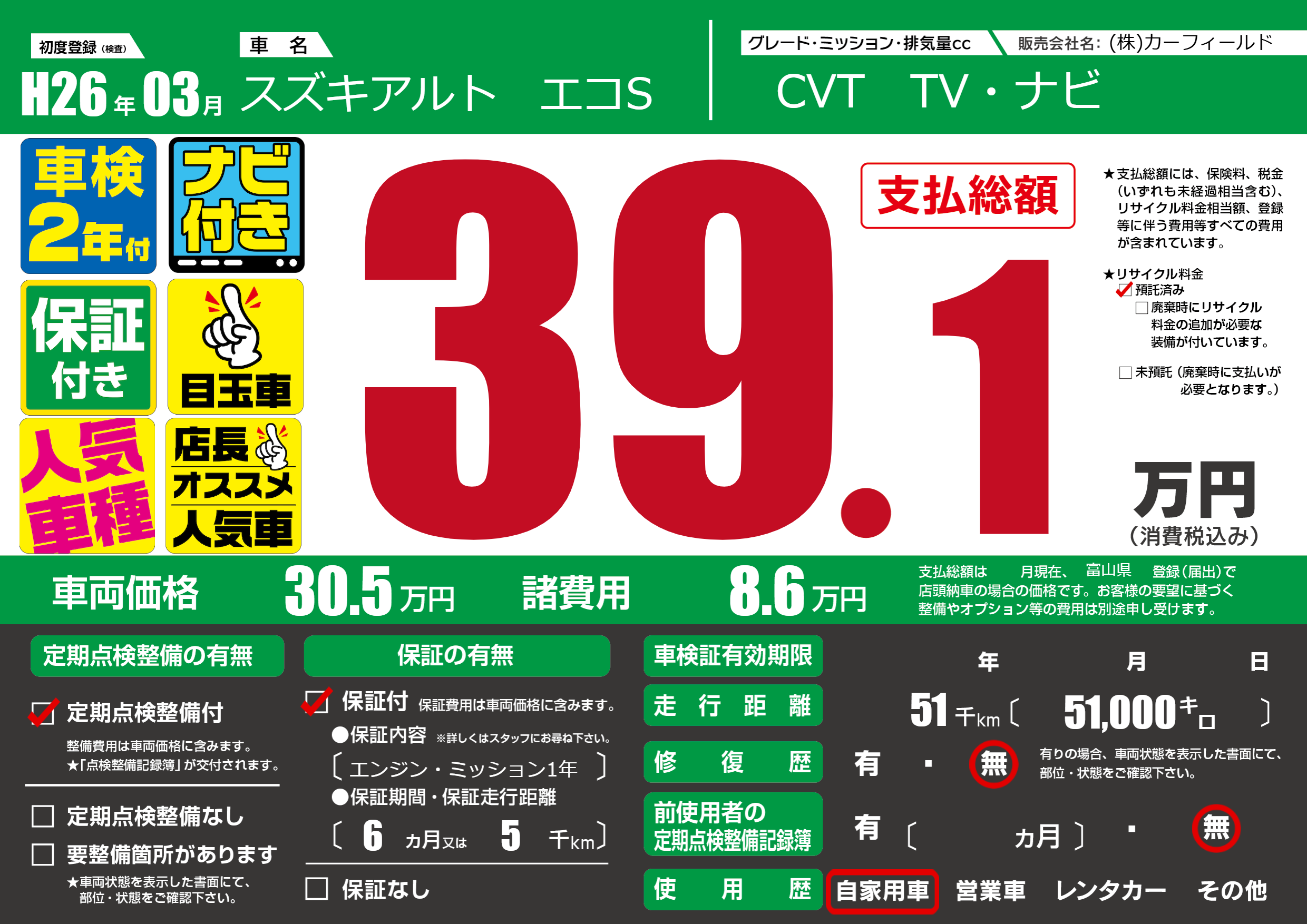 | 走行キロ | 5.1万km | 初年度登録 | H26年03月 |