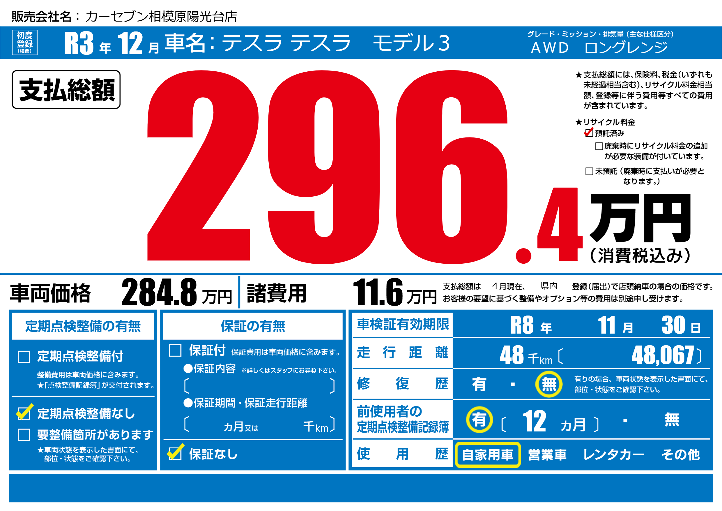 | 車名 | テスラ テスラ モデル3 | グレード ミッション 排気量 |