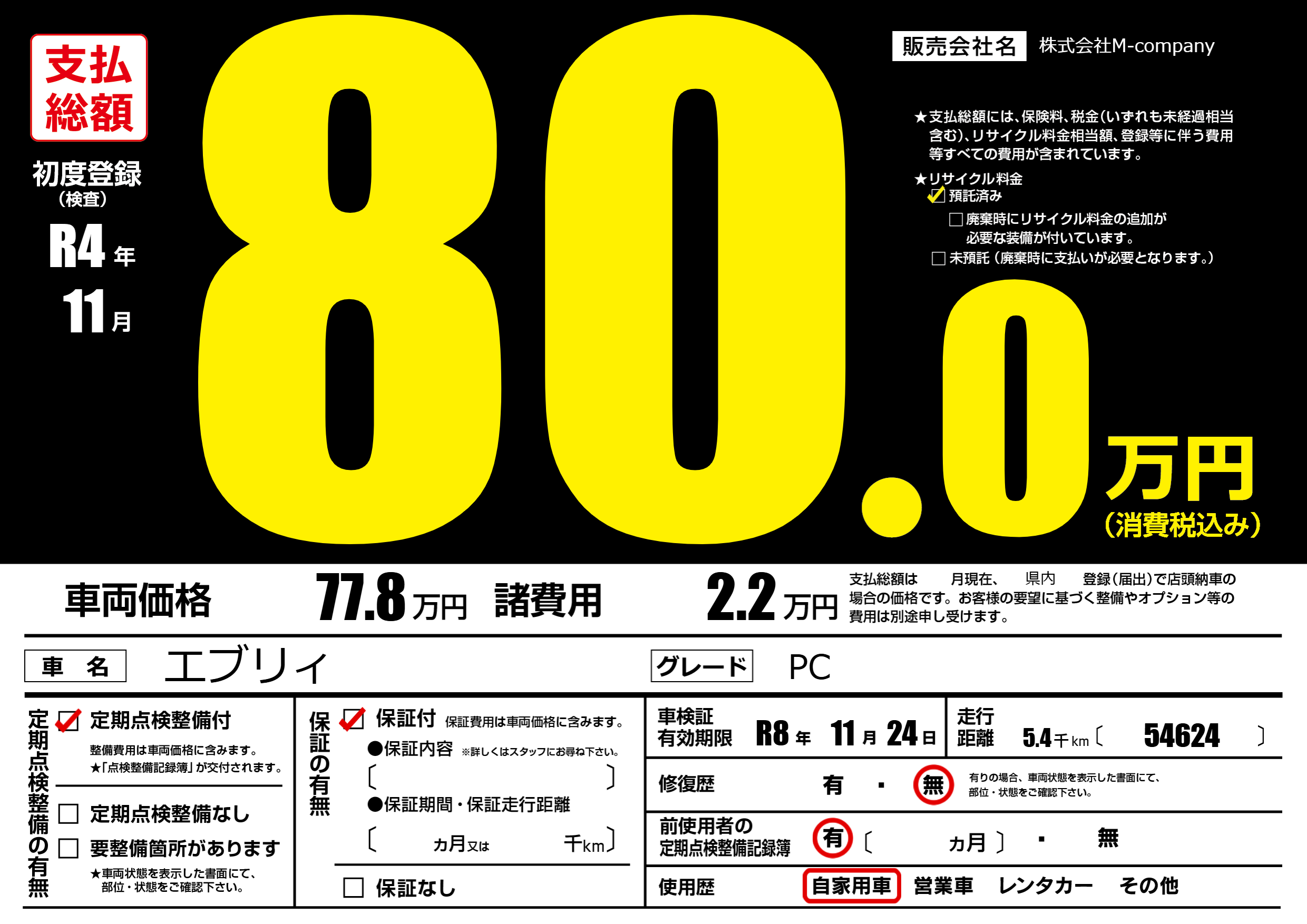 | 走行キロ | 0.5万km | 初年度登録 | R4年11月 |