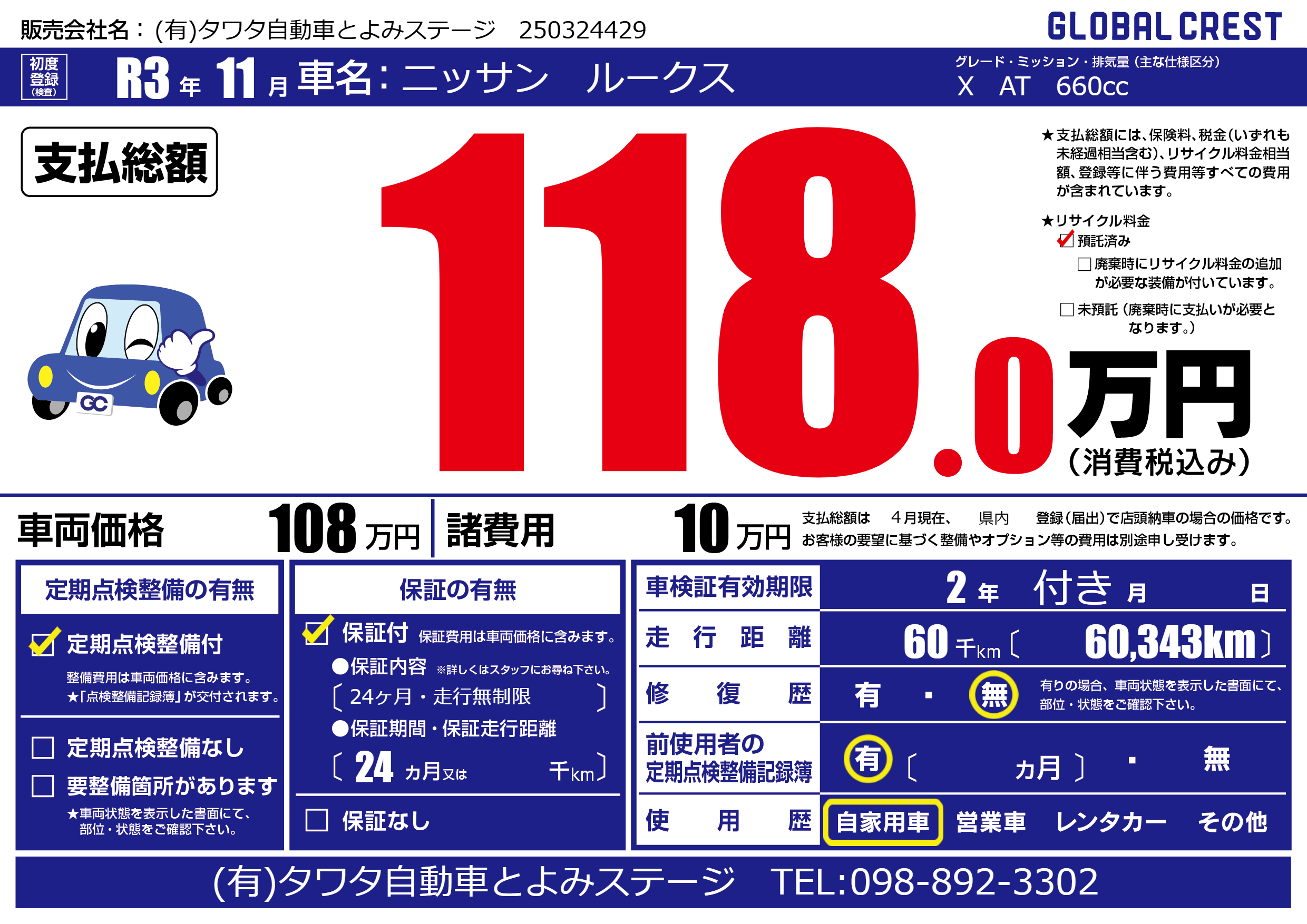 | 走行キロ | 6万km | 初年度登録 | R3年11月 |