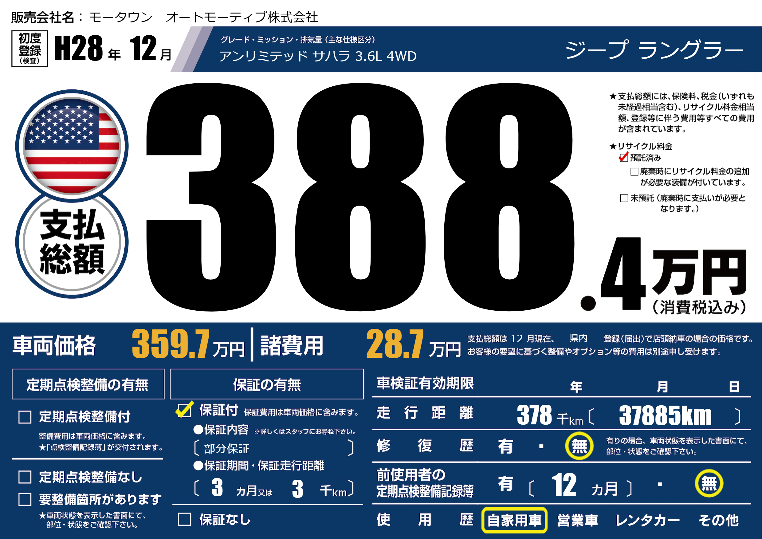 | 車名 | ジープ ラングラー | グレード ミッション 排気量 |