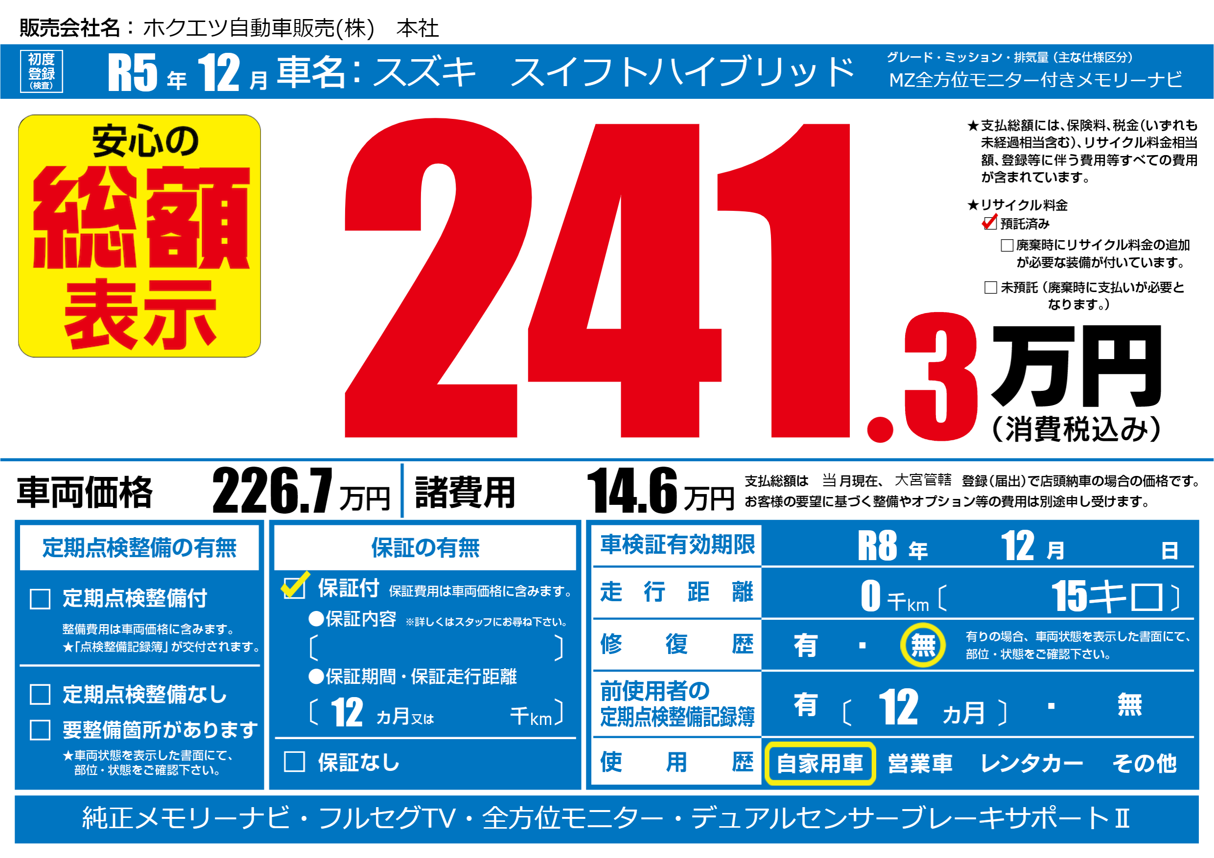 | 車名 | スズキ スイフトハイブリッド | グレード ミッション 排気量 |