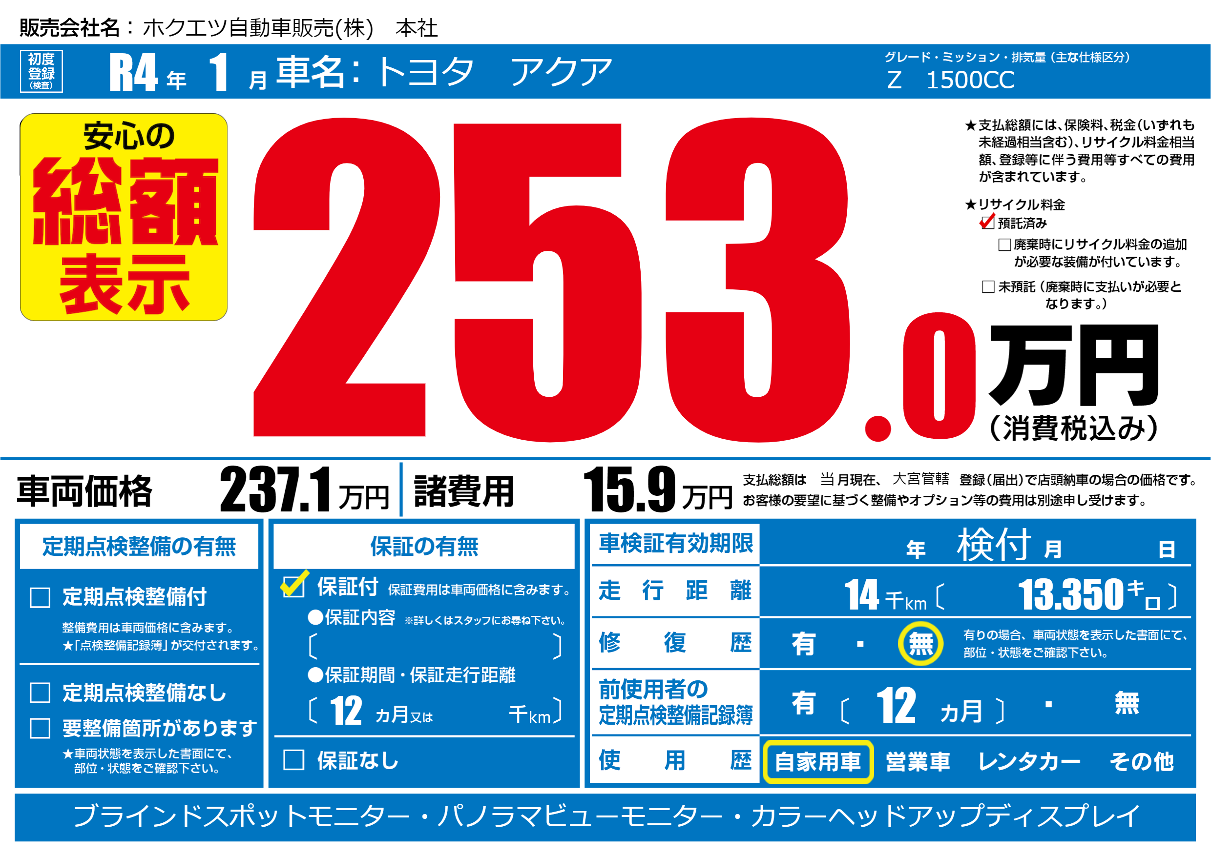 | 走行キロ | 1.4万km | 初年度登録 | R4年1月 |