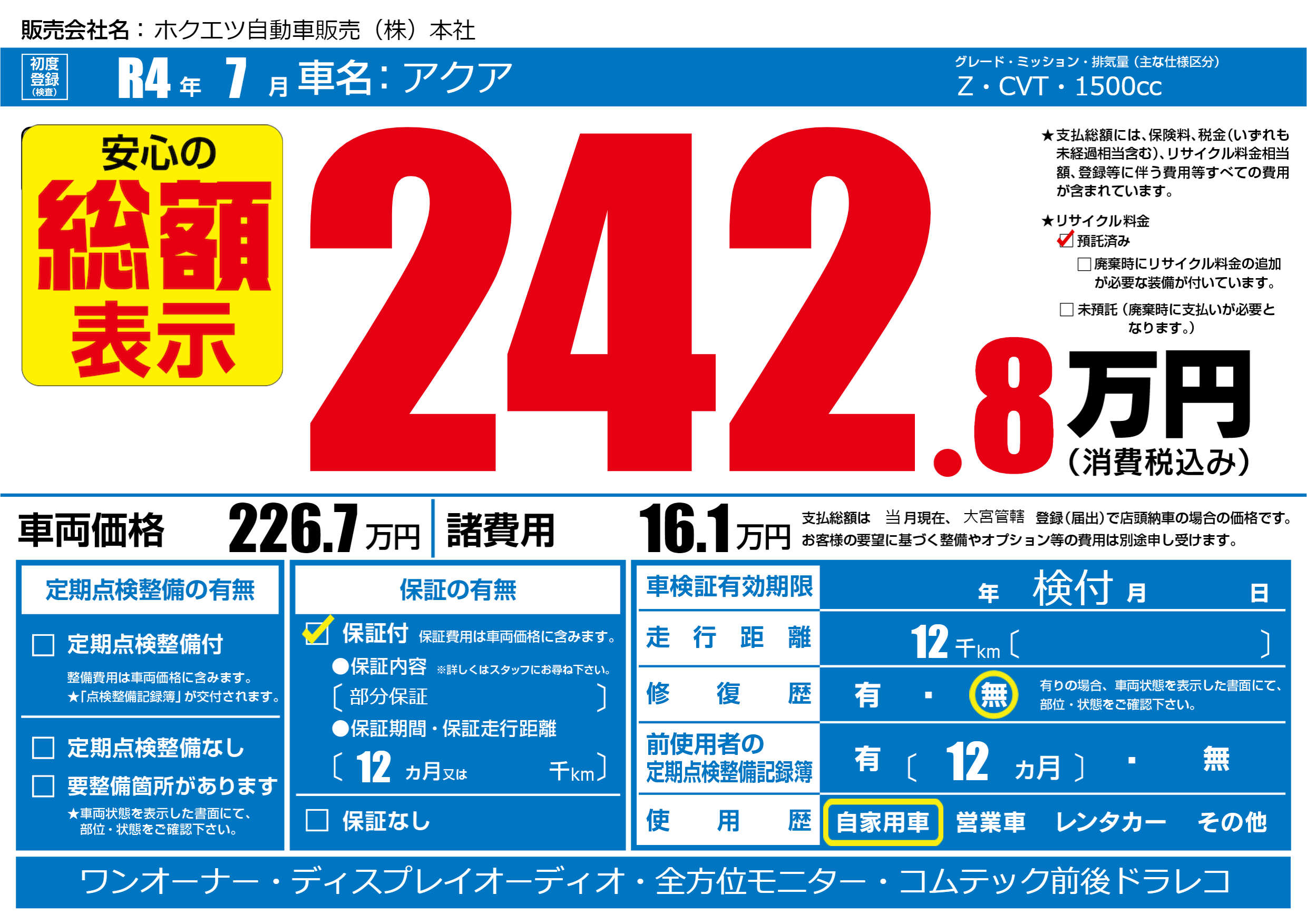 保証付き 保証内容(部分保証) 12ヶ月または()千kmまで |