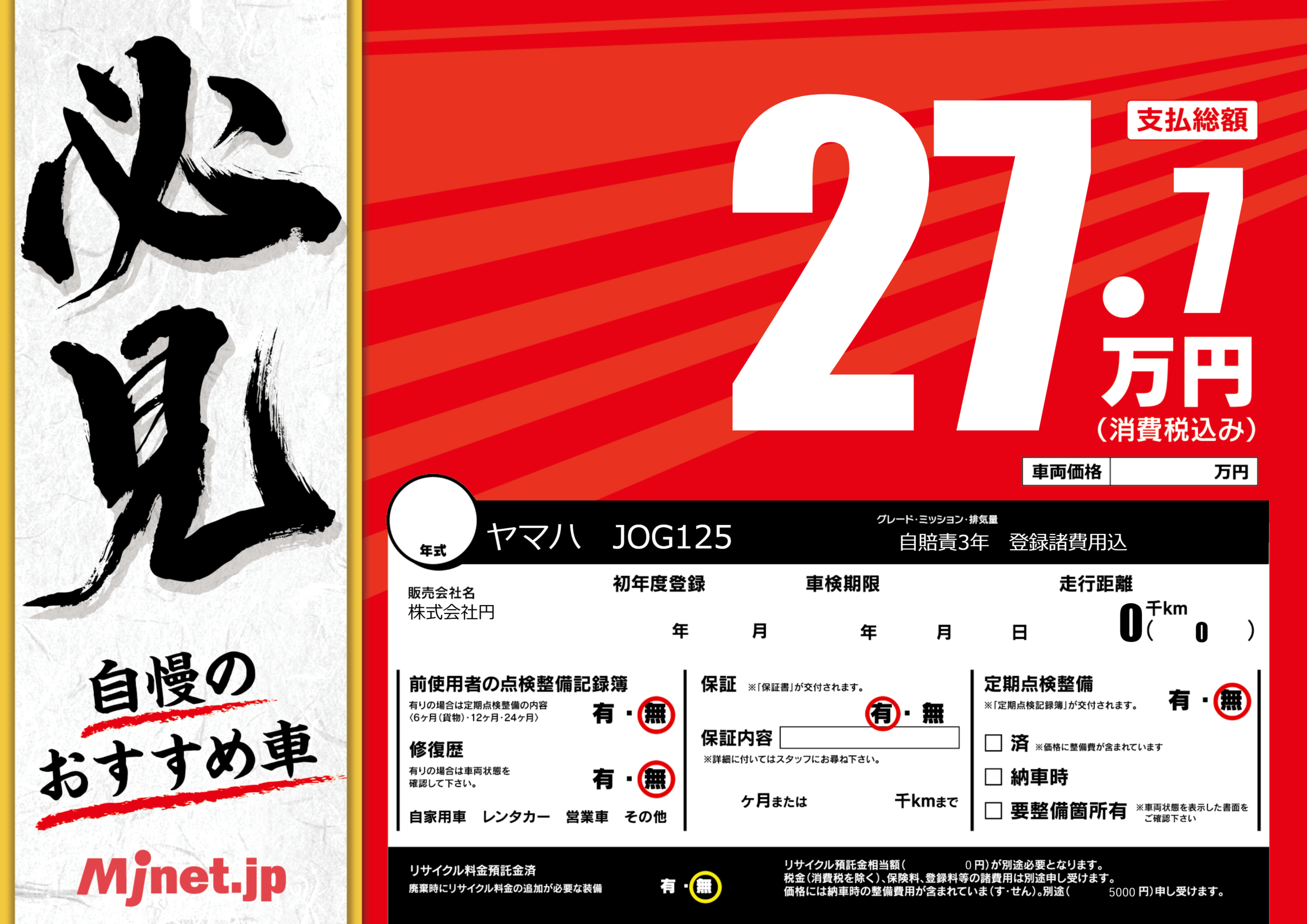 | 車名 | ヤマハ JOG125 | グレード ミッション 排気量 |