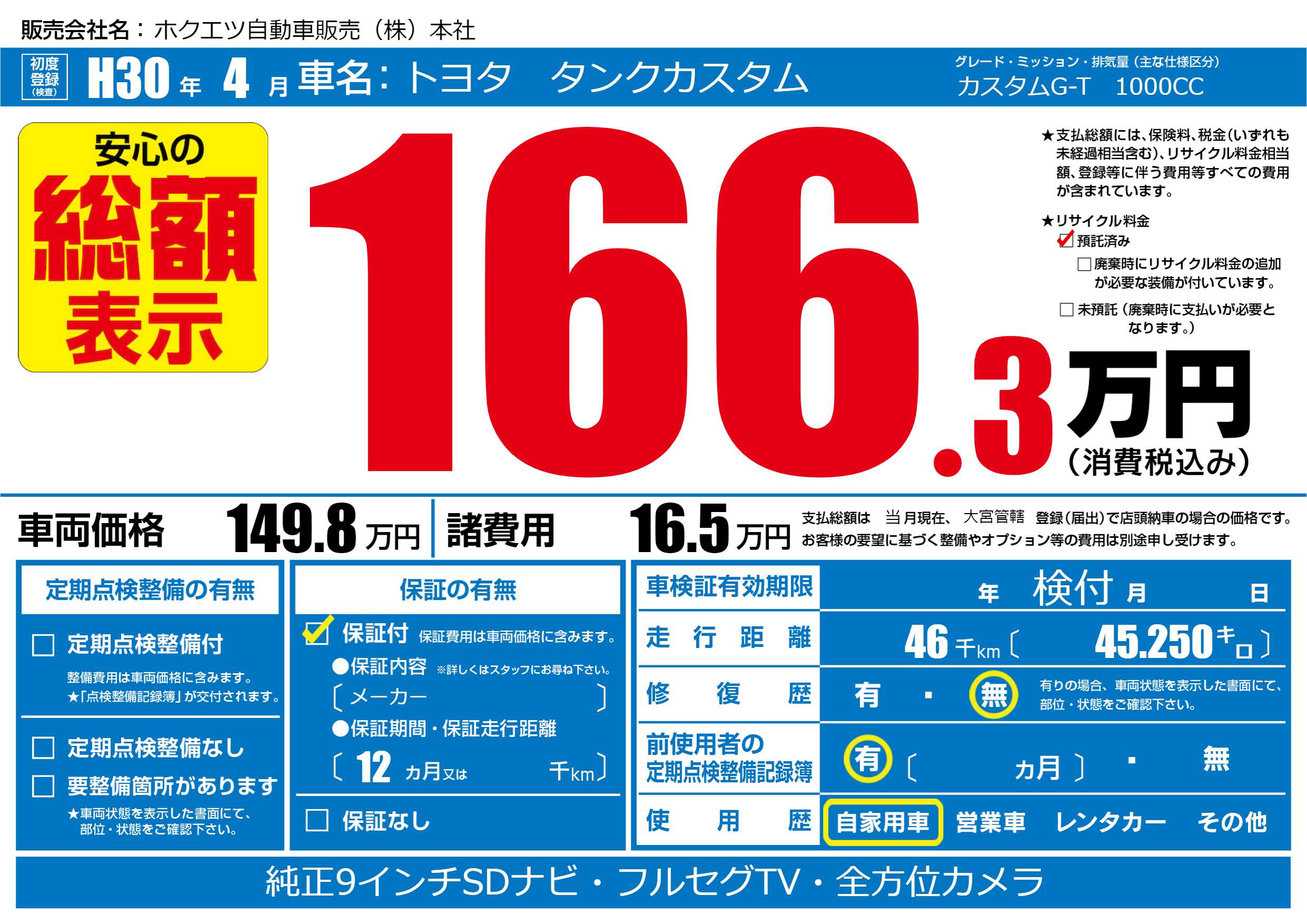 | 車名 | トヨタ タンクカスタム | グレード ミッション 排気量 |