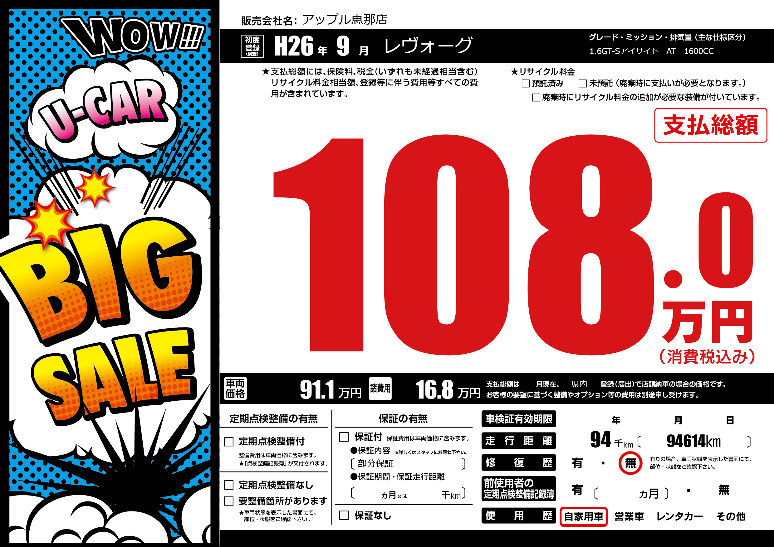 | 走行キロ | 9.4万km | 初年度登録 | H26年9月 |