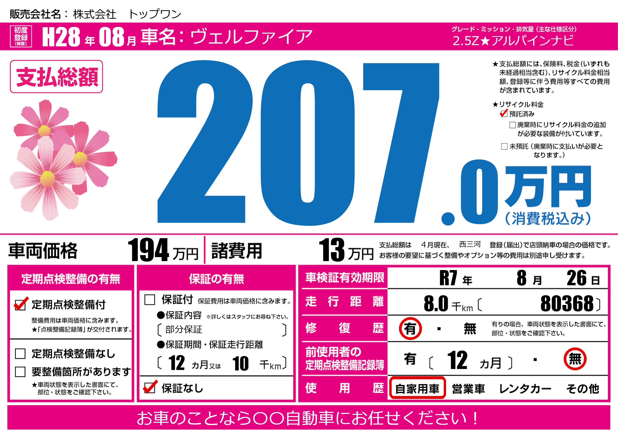なし | 車検制限 | R7年8月26月 |